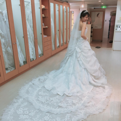トレーンの長さを変えれるので、バージンロードは長く綺麗に、披露宴では動き回るので短くして可愛らしさを出しました。