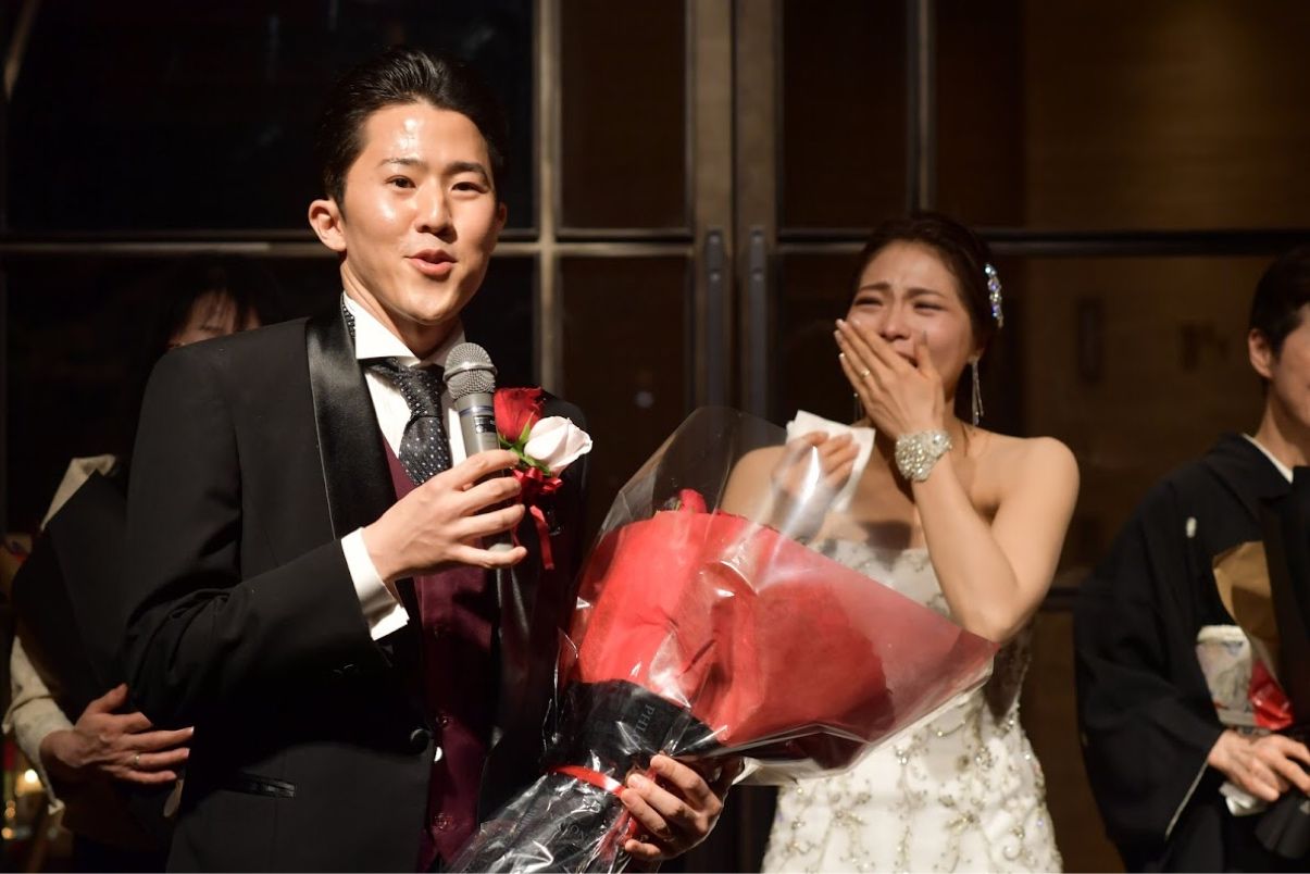 また、披露宴の最後、もう退場するかな…というタイミングでサプライズムービーと100本の薔薇の花束をプレゼントしてくれました。 旦那さんのサプライズとしては定番中の定番である、奥さんの成長過程を産まれた病院から実際に行って巡ってくる…というものだったのですが、こんなに嫌がっていた人がよくやってくれたものだと思って涙が止まりませんでした。 結婚式の準備の間はとにかく私がこだわりが強すぎて彼を置いてきてしまうことが多かったのですが、彼も彼なりに当日を楽しもうと少しずつ心の準備をしてくれていたことがありがたかったです。