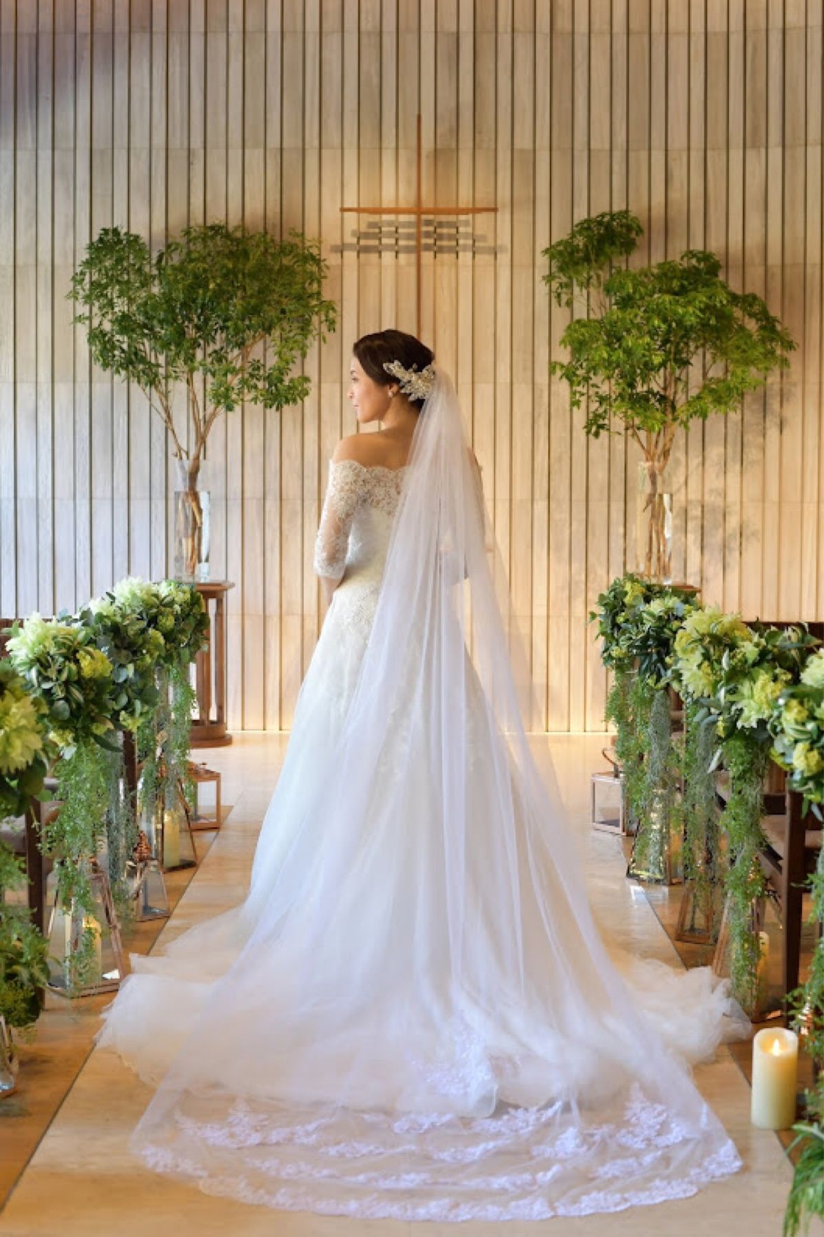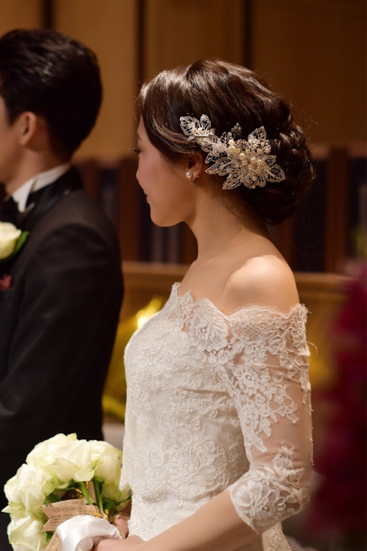 挙式は、オフショルダーのドレスに合わせて清楚なヘアスタイルにしました。 もともとクセが強くてツヤのない髪質なので、波ウェーブにすると、本当にぱさぱさに見えてしまうことが悩みで、大きなツヤのあるウェーブにしていただくようお願いしました。 お願いしたのは、