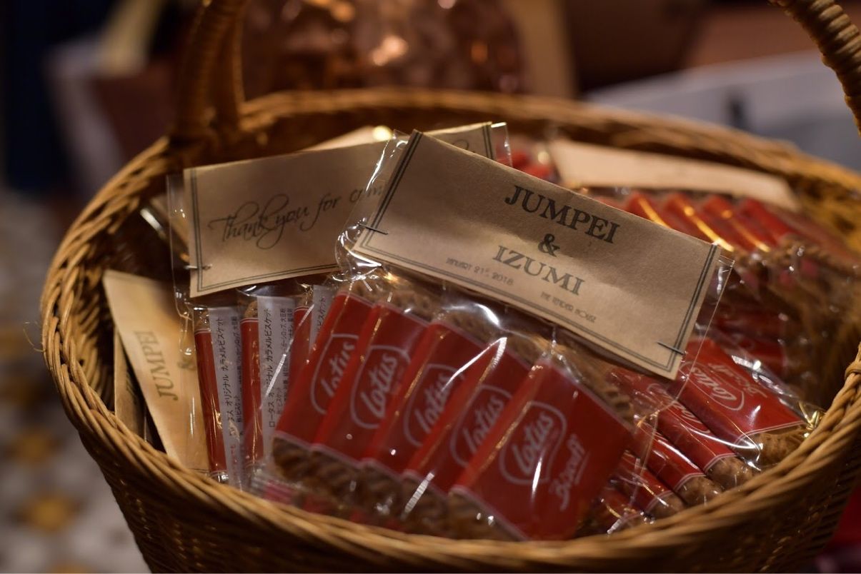 ⇨披露宴は自分が大好きなロータスクッキーを5枚詰めました 100円ショップで買った袋にクッキーを詰めて、DIYしたラベルを合わせてホッチキスで留めただけですが、おしゃれ!と褒めてくださる方がたくさんいらして、嬉しくなりました。
