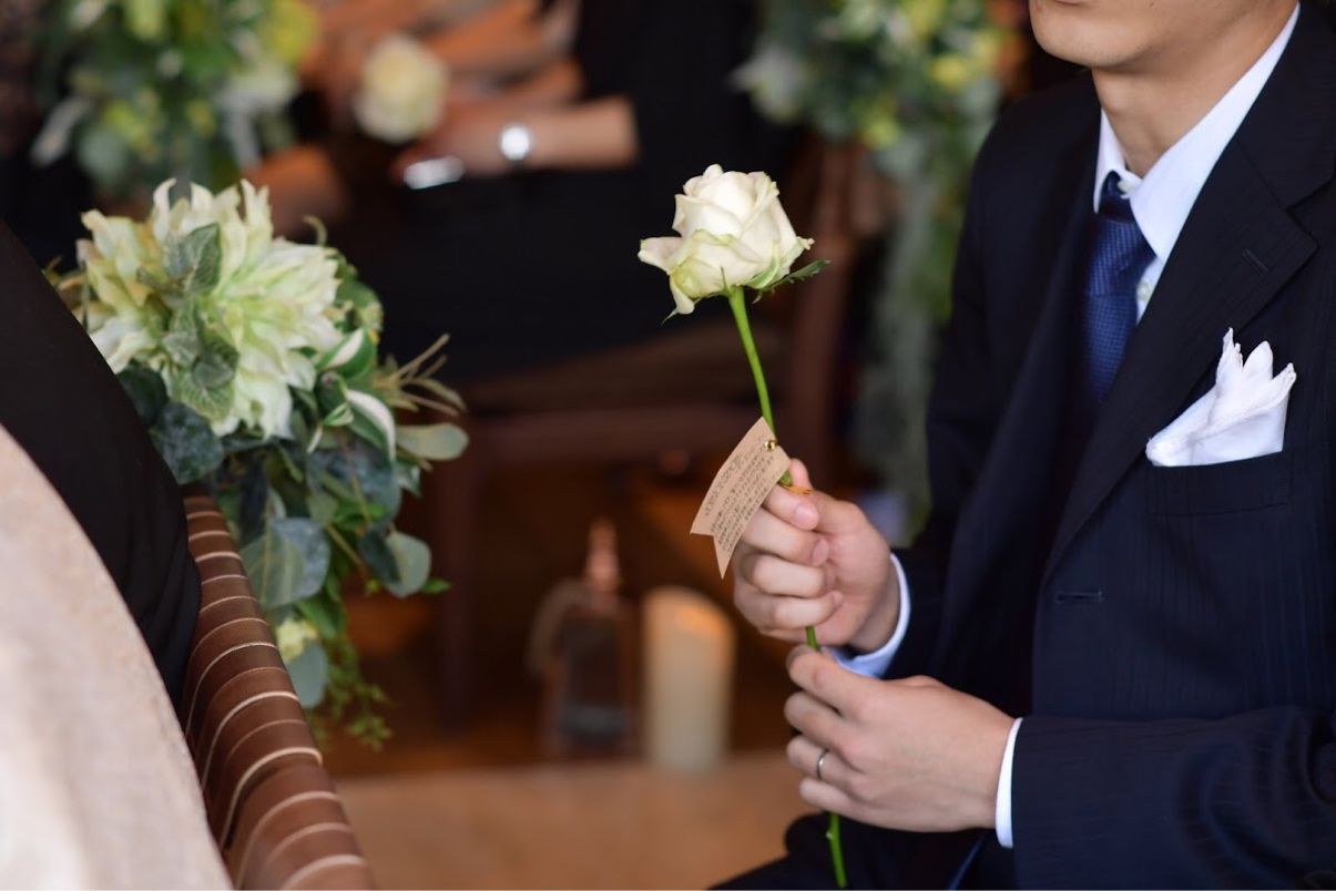 *挙式は人前式とし、より、ゲストの方に関わっていただけるよう、ダーズンローズセレモニーも行いました。特に私たちと関わりの深いゲストの方々にお花をお願いし、私たちのところまでお花を持ってきていただきました。その時間で、司会者の方から簡単なエピソードも紹介していただくことができ、好評でした。誓いの言葉はオリジナルで作成し、最後は誓いのハグにしました。誓いのキスは私も主人も絶対したくない!と思っていたので、ハグにして正解だったなと思います。