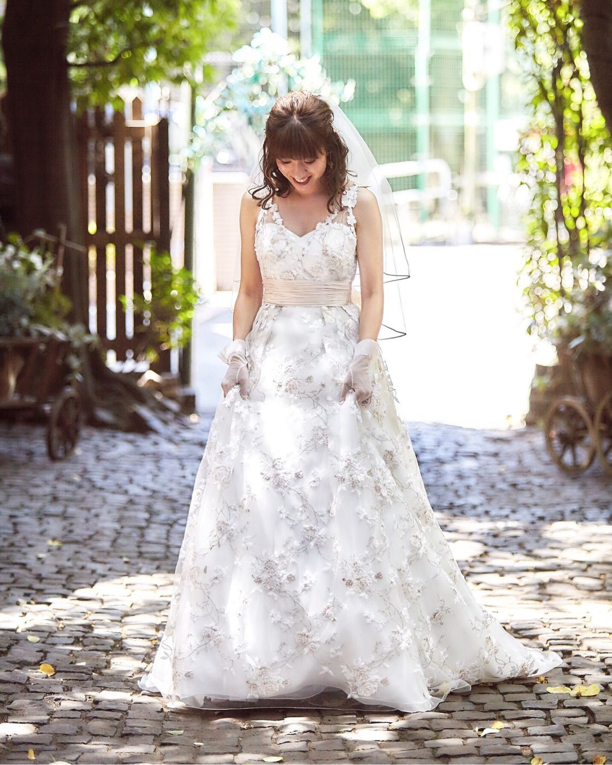 王道の真っ白のウェディングドレスを絶対着たい!と思い試着していたのですが、実はGRANMANIE銀座さんに入店した時に挙式の時に来たドレスと最初に目が合い(笑)、なんとなーーく気になったので、試着させていただいたら、とってもとってもかわいくて、これだ!!となりました。試着する前は淡いピンクでお花の刺繍だったので、アラサーなのにブリブリかなと思ったのですが、着てみると意外と大人っぽく上品で、Bon Bon Bon La faitmaisonさんにぴったりだなと思いました。