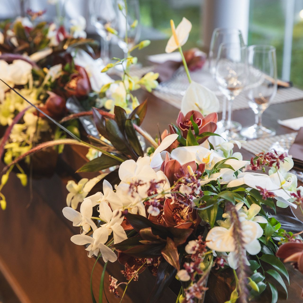 色々悩みましたが、元々希望していたブラウンとボルドーを基調としたシンプルな花材で会場を彩ることができました!