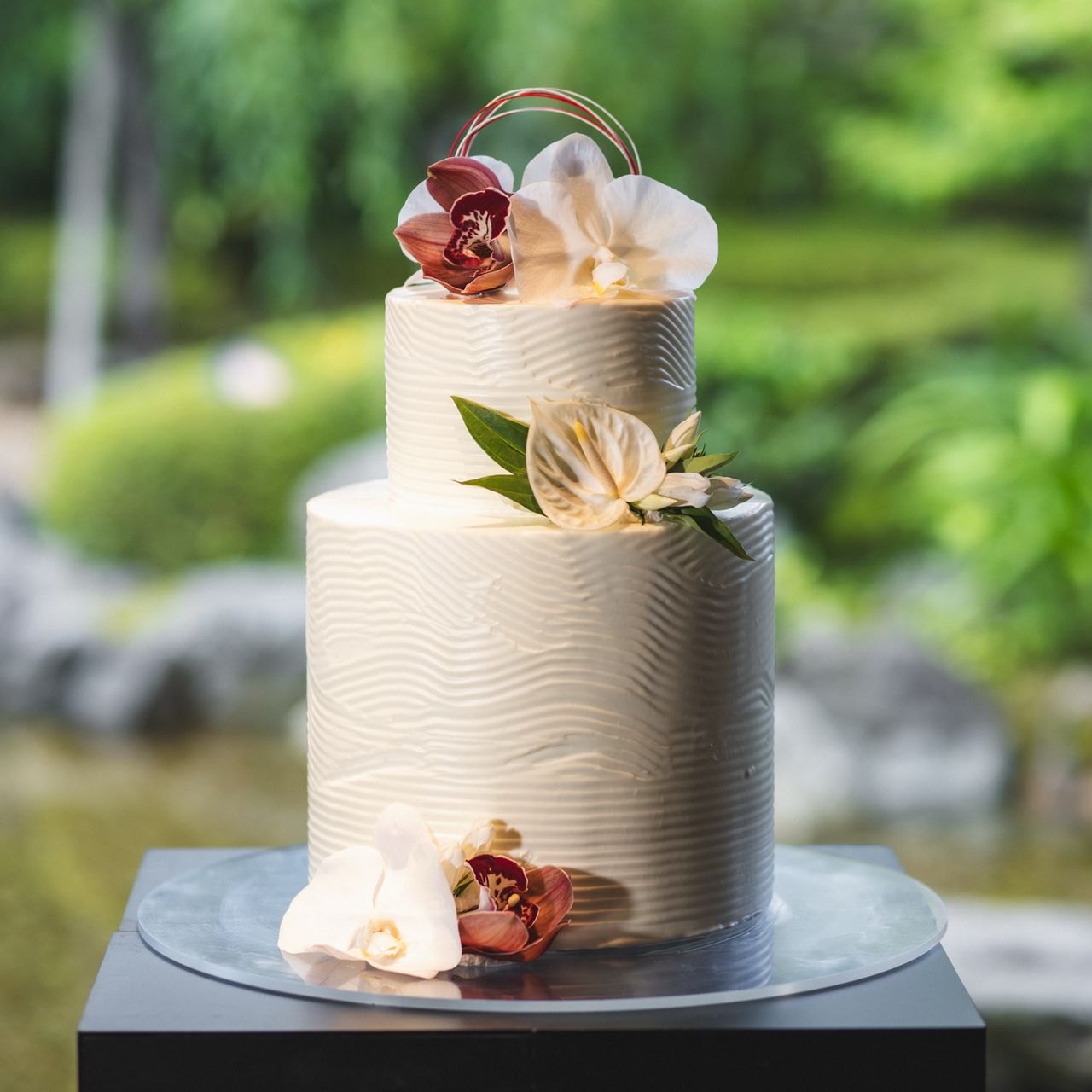 こだわった会場装花と同じ花材をケーキにあしらっていただき、とても理想的なデザインになったと感じています。