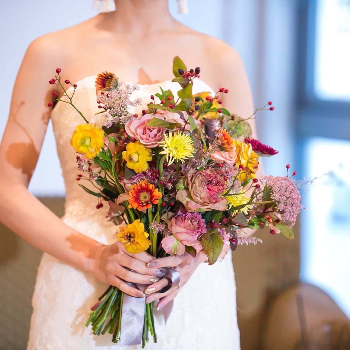 オレンジや濃い色味のお花を使っていただくようにお願いしました!