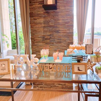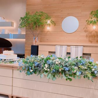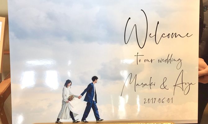テーマはナチュラル。 会場の雰囲気に合わせ、ウェルカムスペースもウッドベースの写真立てやドライフラワーを飾りました。