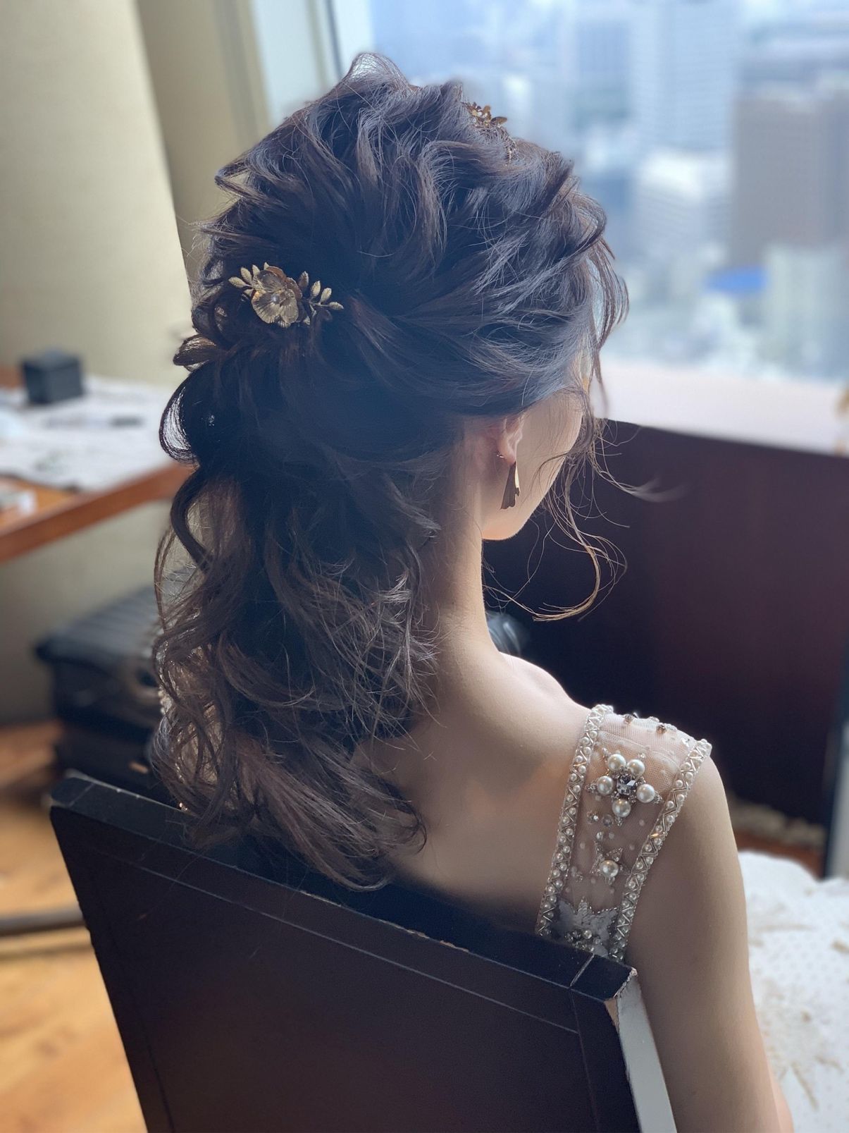 アクセサリーをゴールドにして、ふわふわの低めポニーにしていただきました!