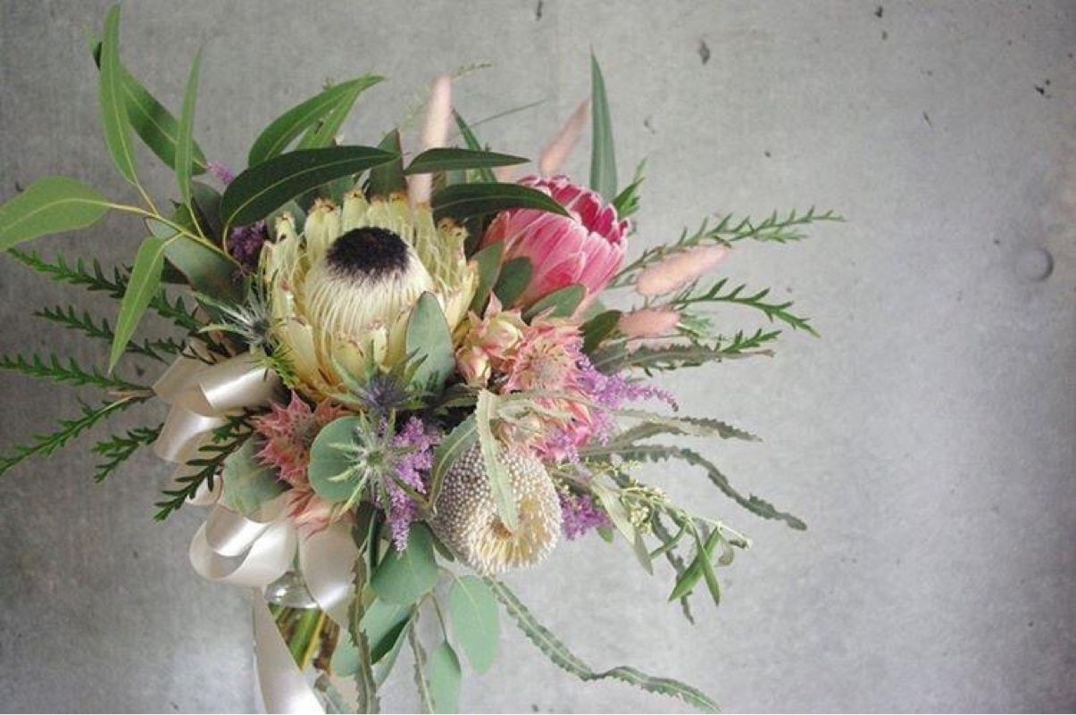 プロテアを入れてワイルドで南国っぽい雰囲気、全体的に淡いピンク色のイメージのもの。