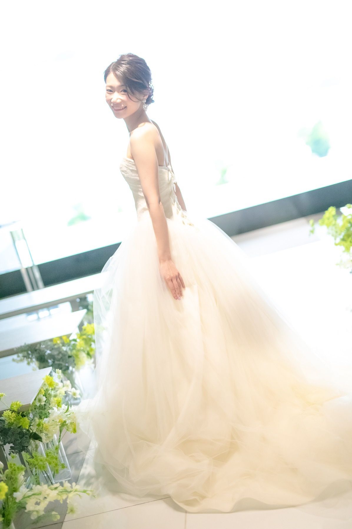 ふわふわの綺麗なチュール、背中のリボンのようなボタン、全体のシルエット、パニエなしでも綺麗なボリュームが素敵です。