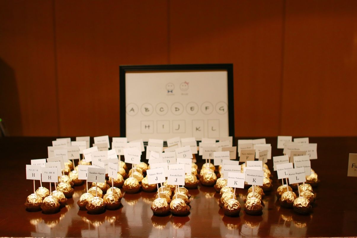 席次表は作らず、代わりにエスコートカードをチョコレートに刺したものを並べて、ゲストのみんなに探してもらうという少し変わった方法にしてみました。