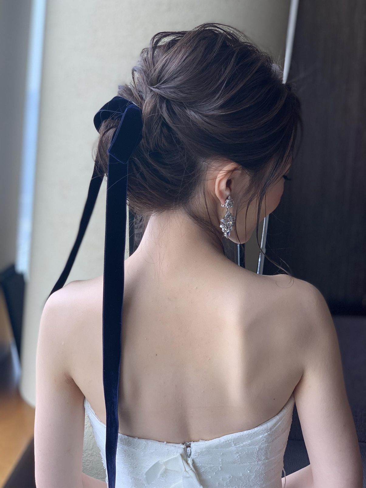 ベロアのリボンを使いたかったので、リボンを使ってゆるいけど上品で綺麗めなアップにしていただきました。