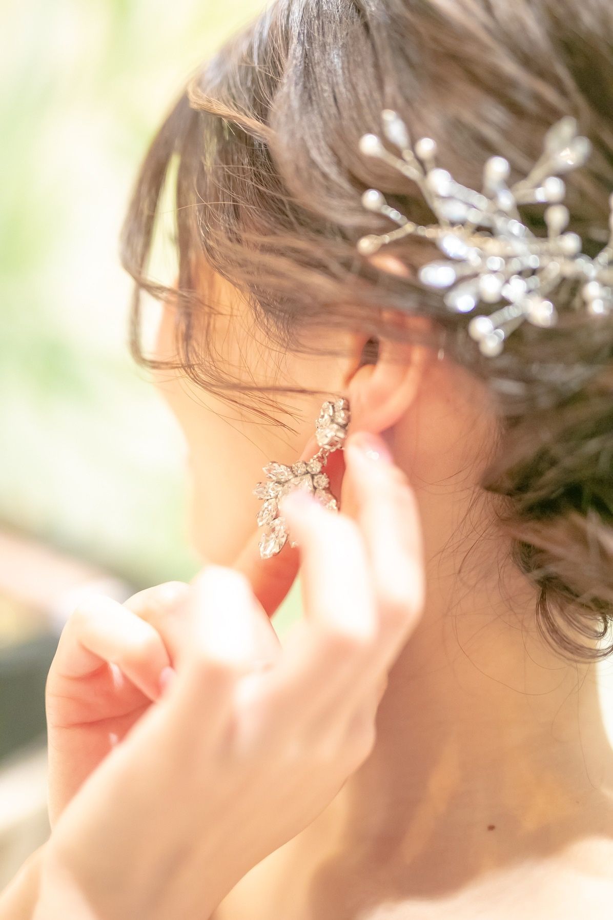 低めのシニヨンだったので、サイドに枝のようにビーズが枝分かれしているヘッドアクセサリーをつけました。