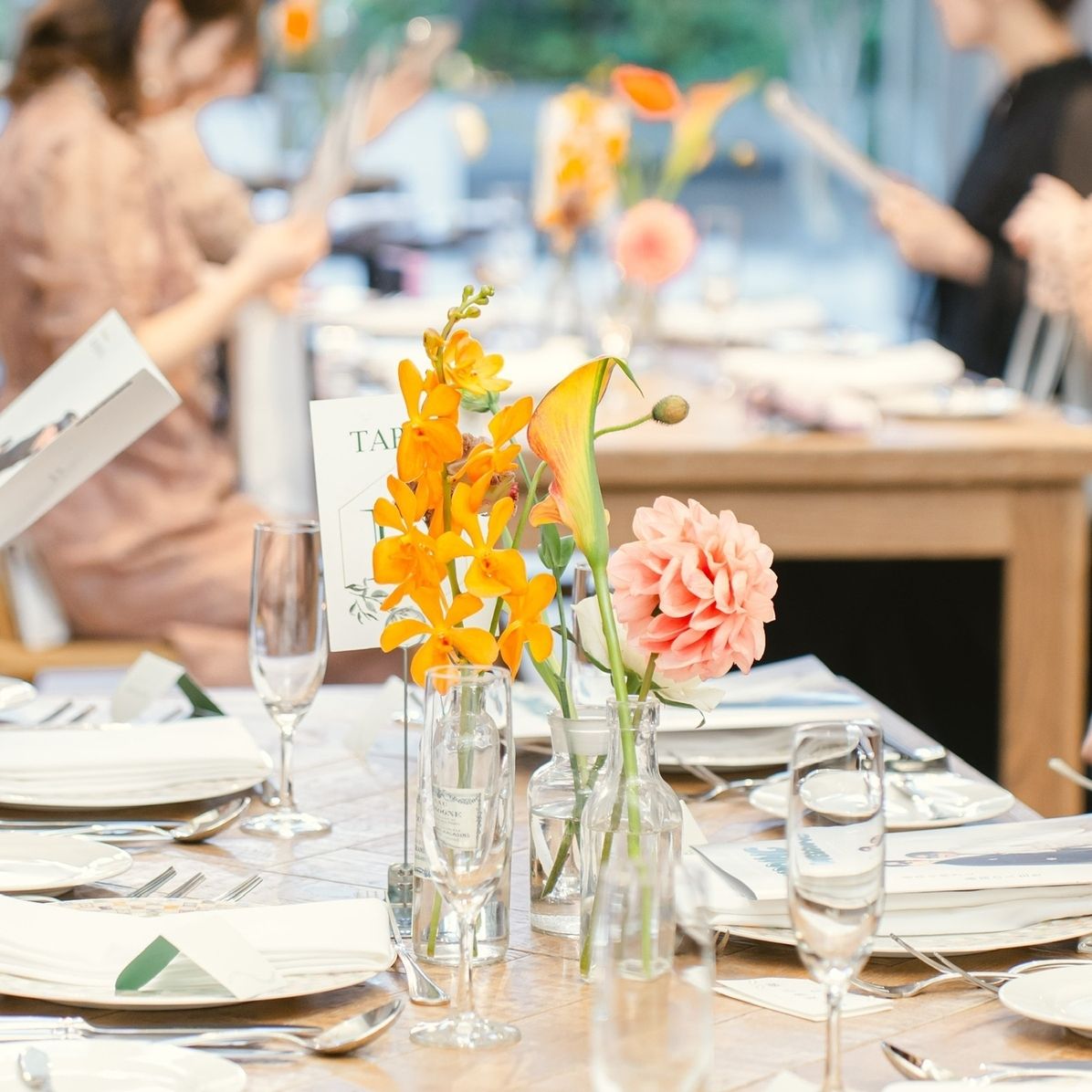 後ろがガーデンだったので、黄色やピンク、オレンジなど、映える色を選びました。その色だけだと可愛すぎてしまうので、紫なども入れて大人っぽくしたことがこだわりです。また、各卓に小瓶でお花を置いてもらったのもポイントです。