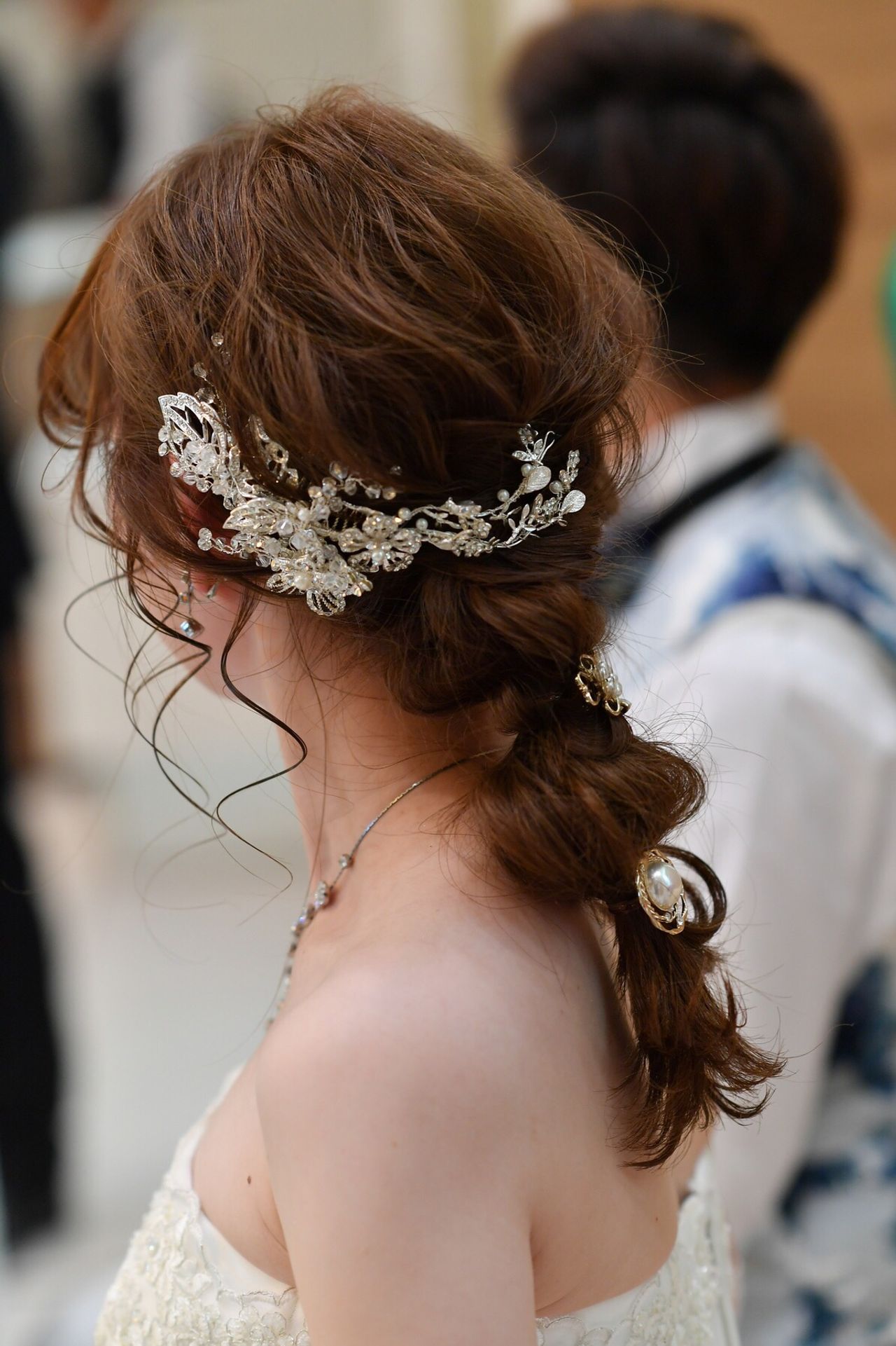 披露宴ウエディング 大きめのアクセサリーをサイドに、玉ねぎのとこにヘアーカフ