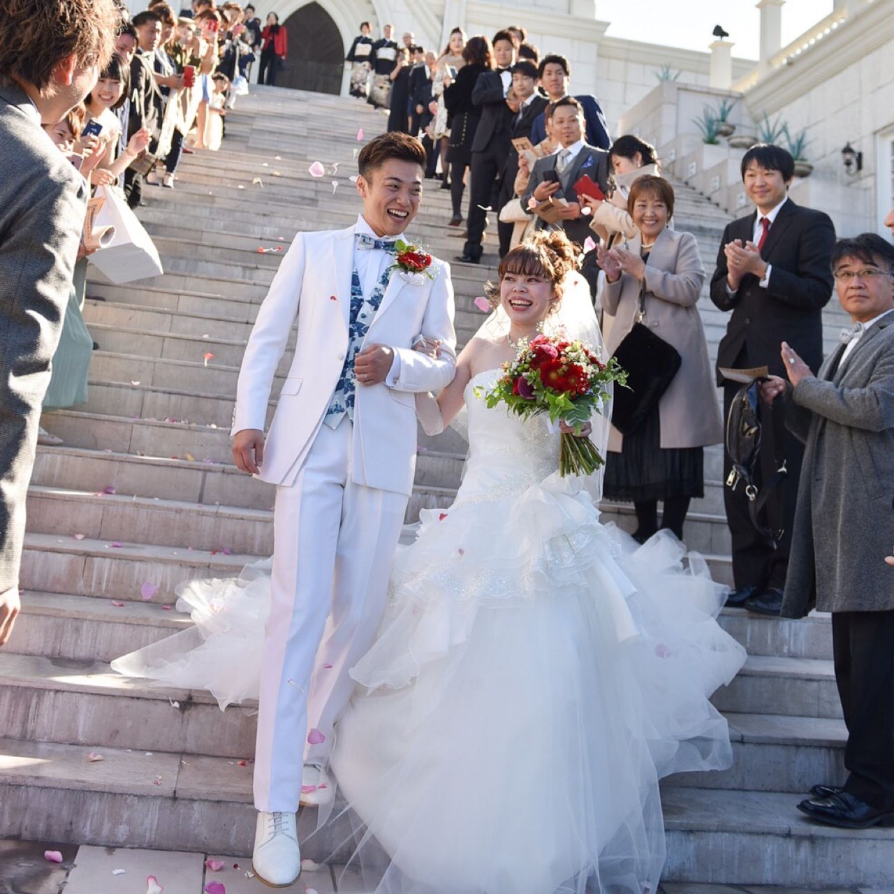 フラワーシャワーの時は列席者も多かったので階段の下まで並んでくれて、ドアオープンして下まで並んでいるのを見ても、下まで降りて後ろ振り返って見ても、どちらからの景色も最高でした。