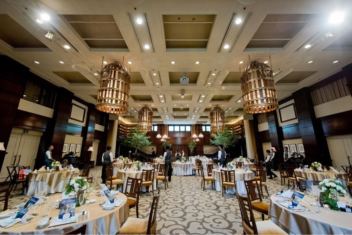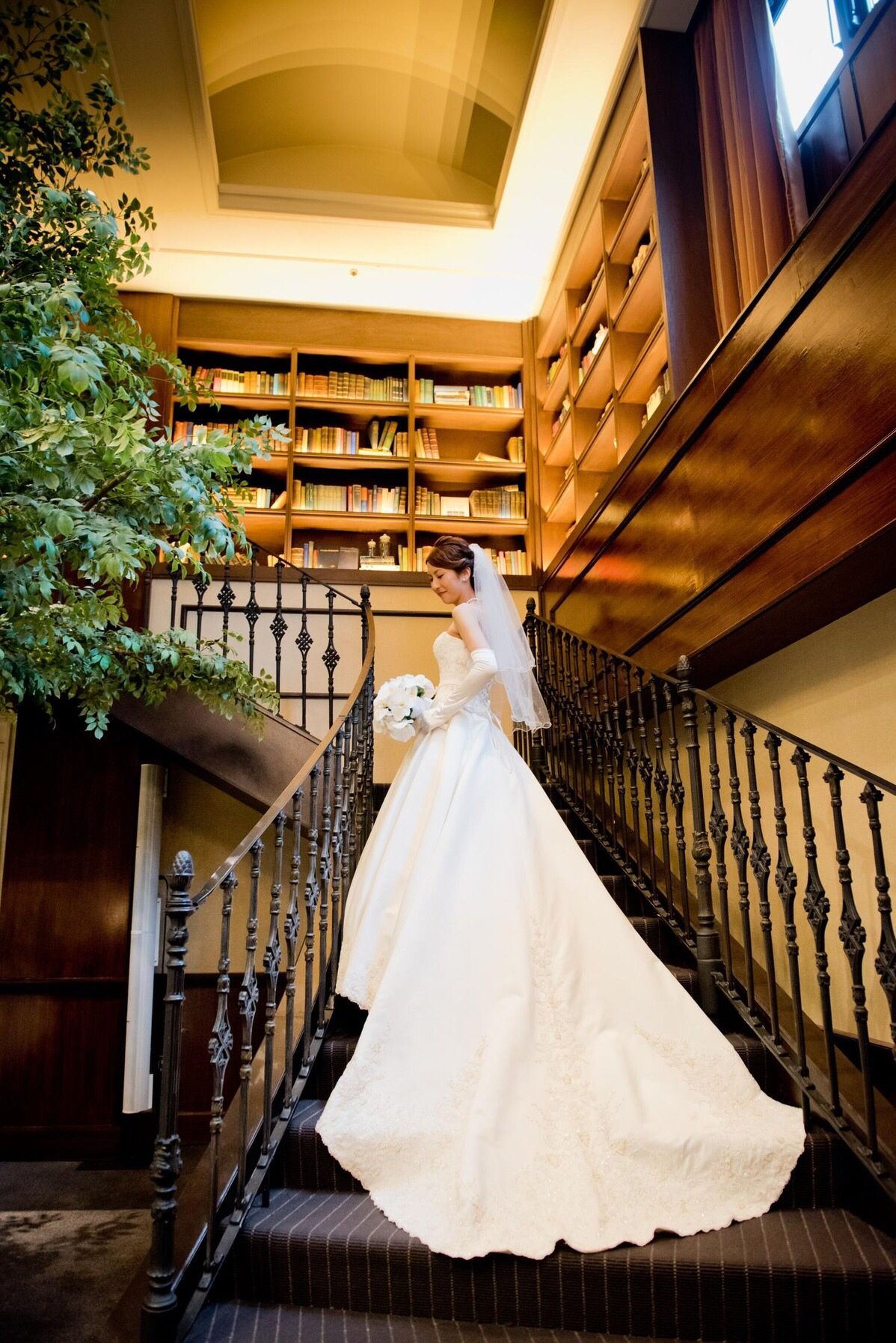 2階分の高さがあるため、とっても開放感があります! また、披露宴会場には珍しく、木のブラウンが基調となっていて、後方に大きな木と階段、洋書が収められた本棚があるため、アンティークでおしゃれな雰囲気です!
