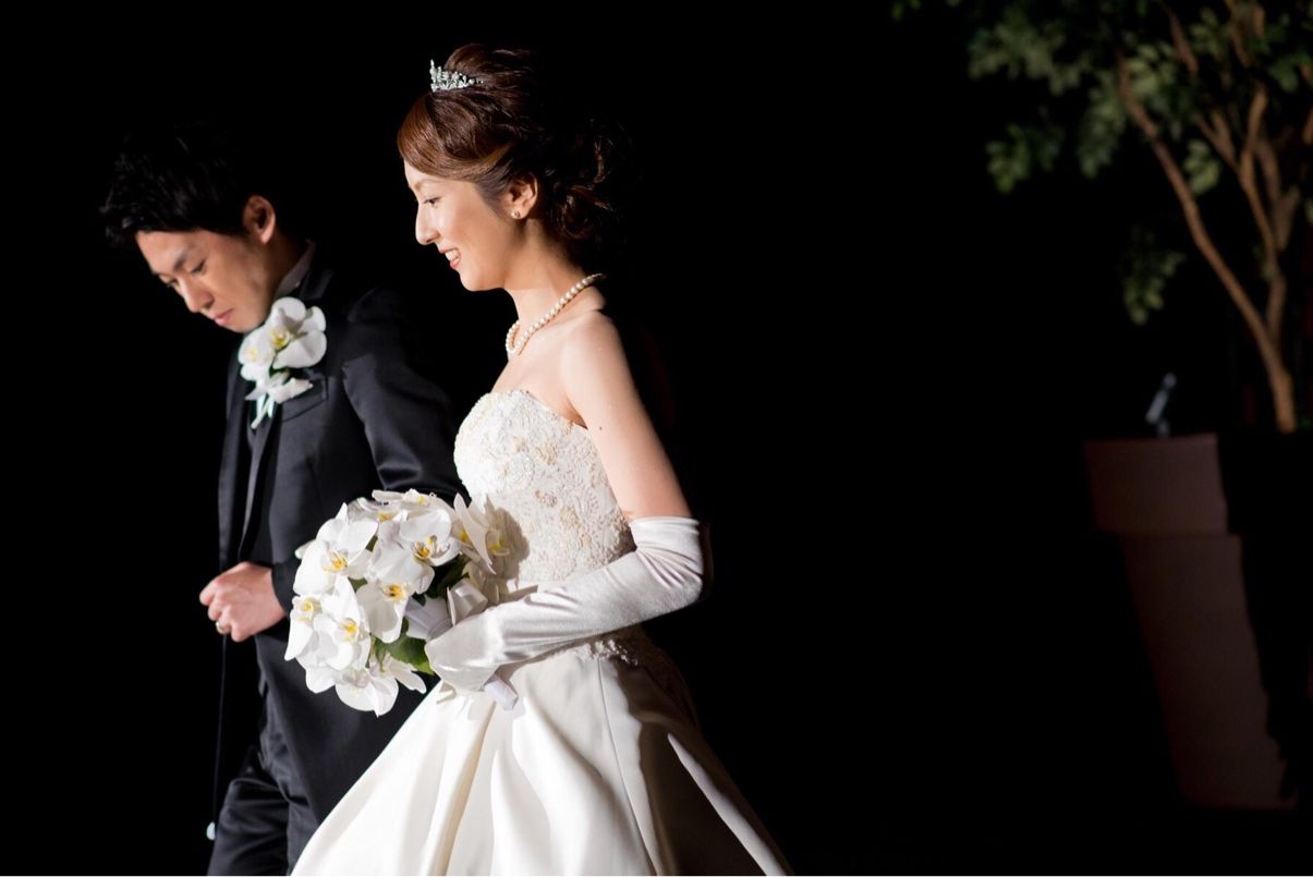 お色直しでは、ブーケと同じ胡蝶蘭の生花を付けて、顔まわりを明るくしました。