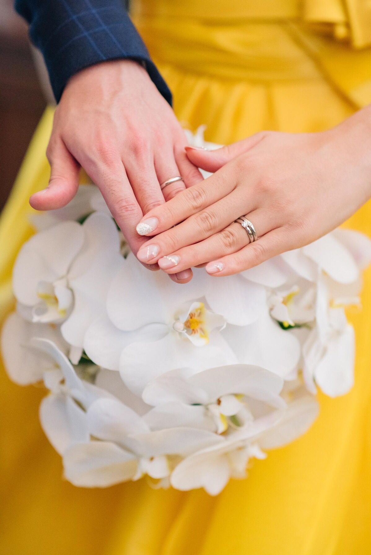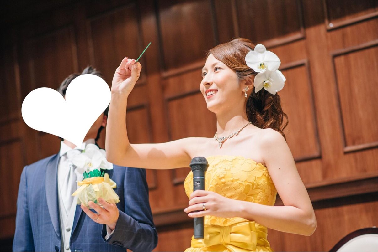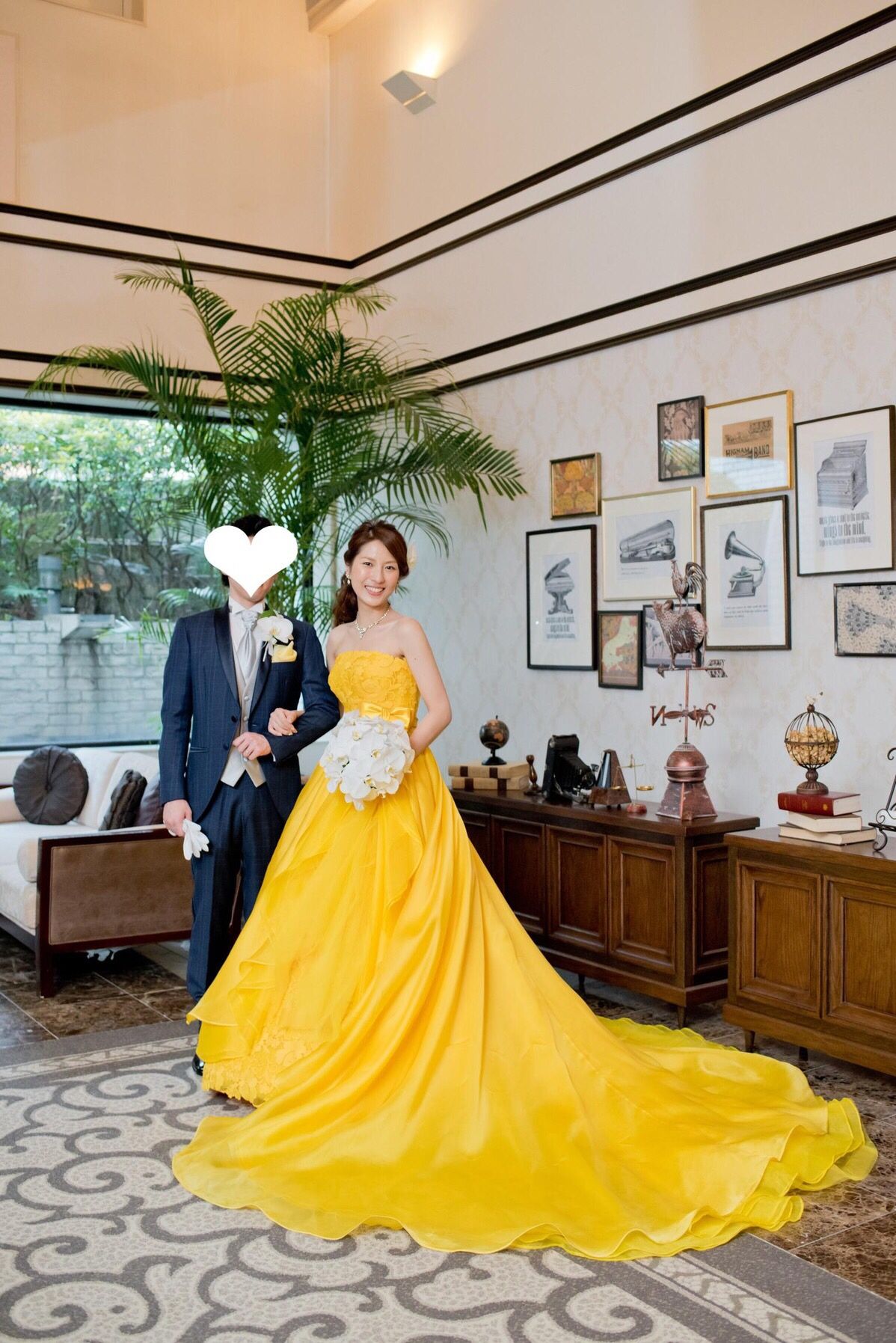 ネイビーは年齢を重ねても着られるカラーでゲストも着用してくる場合が多い点、会場が広いのでマンゴーイエローの方が目立つという2点の理由でイエローのドレスに決めました。