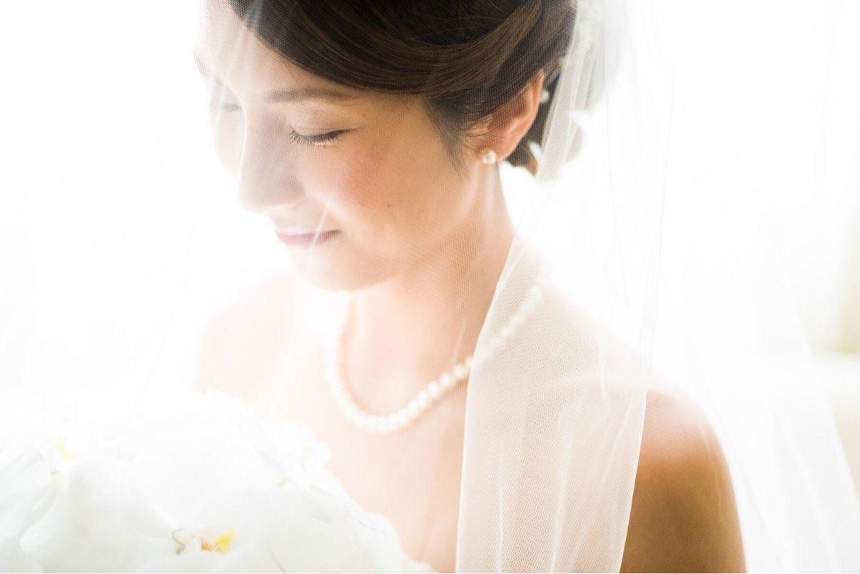 挙式では母から受け継いだパールのネックレスに、自分で作った樹脂ノンホールピアスのパールイヤリング、