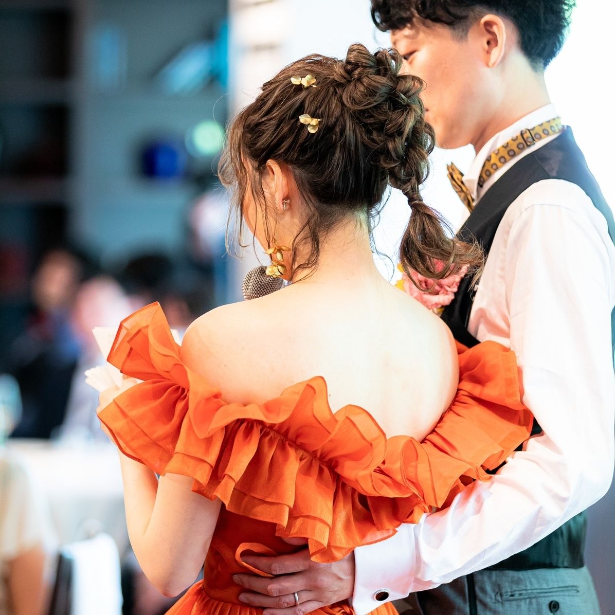 ヘアは前髪をセンター分けのウェーブ巻きにし、後ろはゆるふわシニヨンにしました。メイクはオレンジ系、マットよりの艶系にしています。