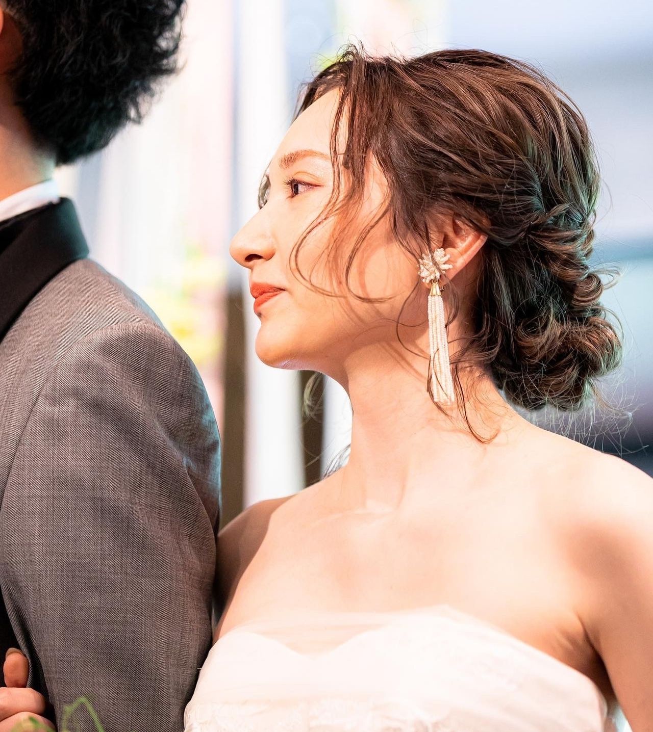 披露宴入場はクリーム色の細かいビーズで作られた垂れるデザインのイヤリングです。ハートカットのドレスで肩周りが寂しかったので、こちらを選びました。
