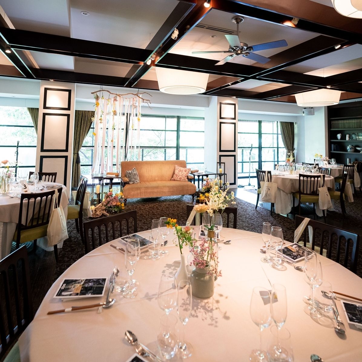 式場には1階と2階に披露宴会場があります。私たちは2階で行いましたが、白とブラウンが基調のナチュラルで落ち着いた雰囲気の会場でした。高砂の後ろにはテラスがあり、たくさんの緑が見えます。お色直しの入場はそのテラスから入場ができ、ほとんどのゲストが驚いていました!!
