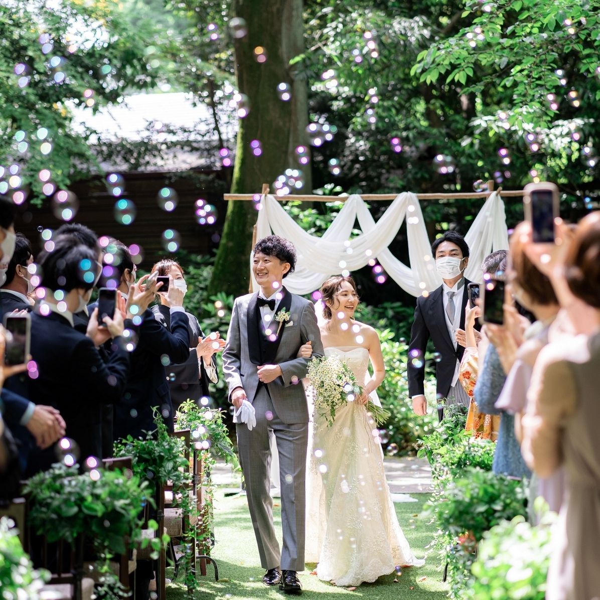 陽がたっぷりと差し込み、緑がキラキラと輝くガーデンならではのナチュラルでお洒落な空間の中、挙式ができます。