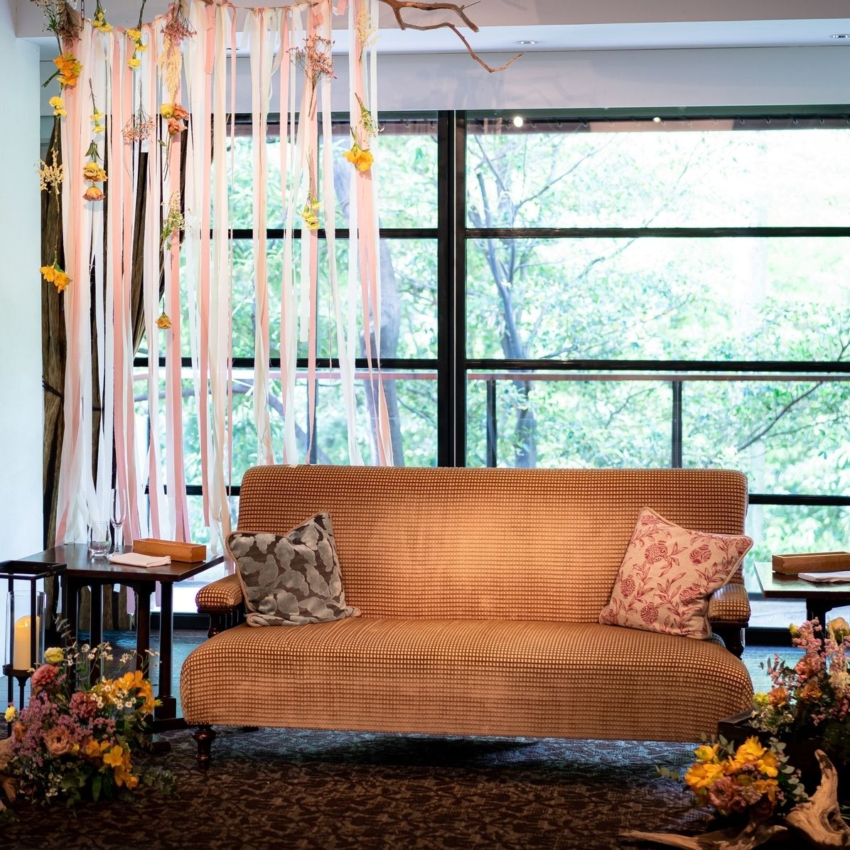 高砂にリボンで作った結婚証明書を飾ったので、そちらの色味にも合わせていただきました。また、リボンの結婚証明書と一緒にフラワーカーテンにしていただきました。可愛く出来上がっていたのでよかったです!