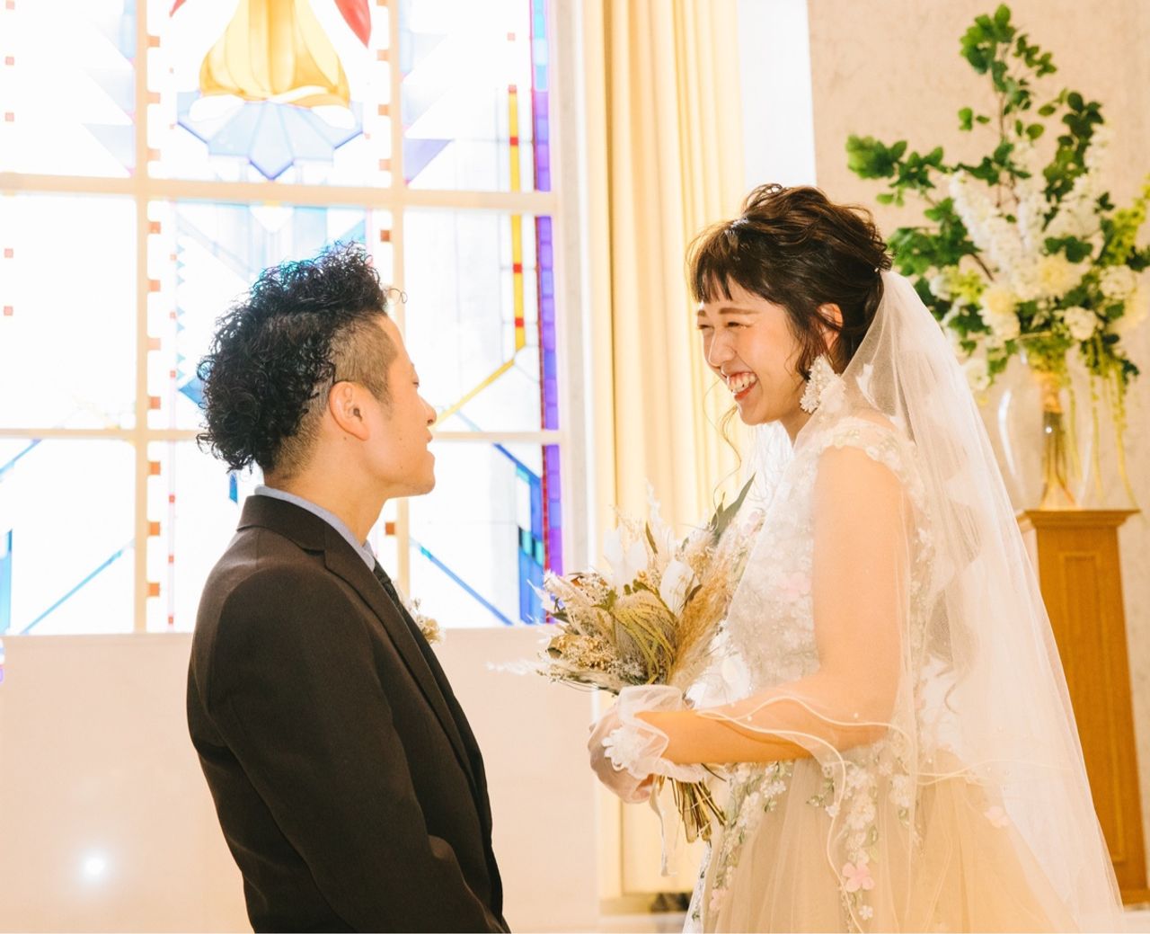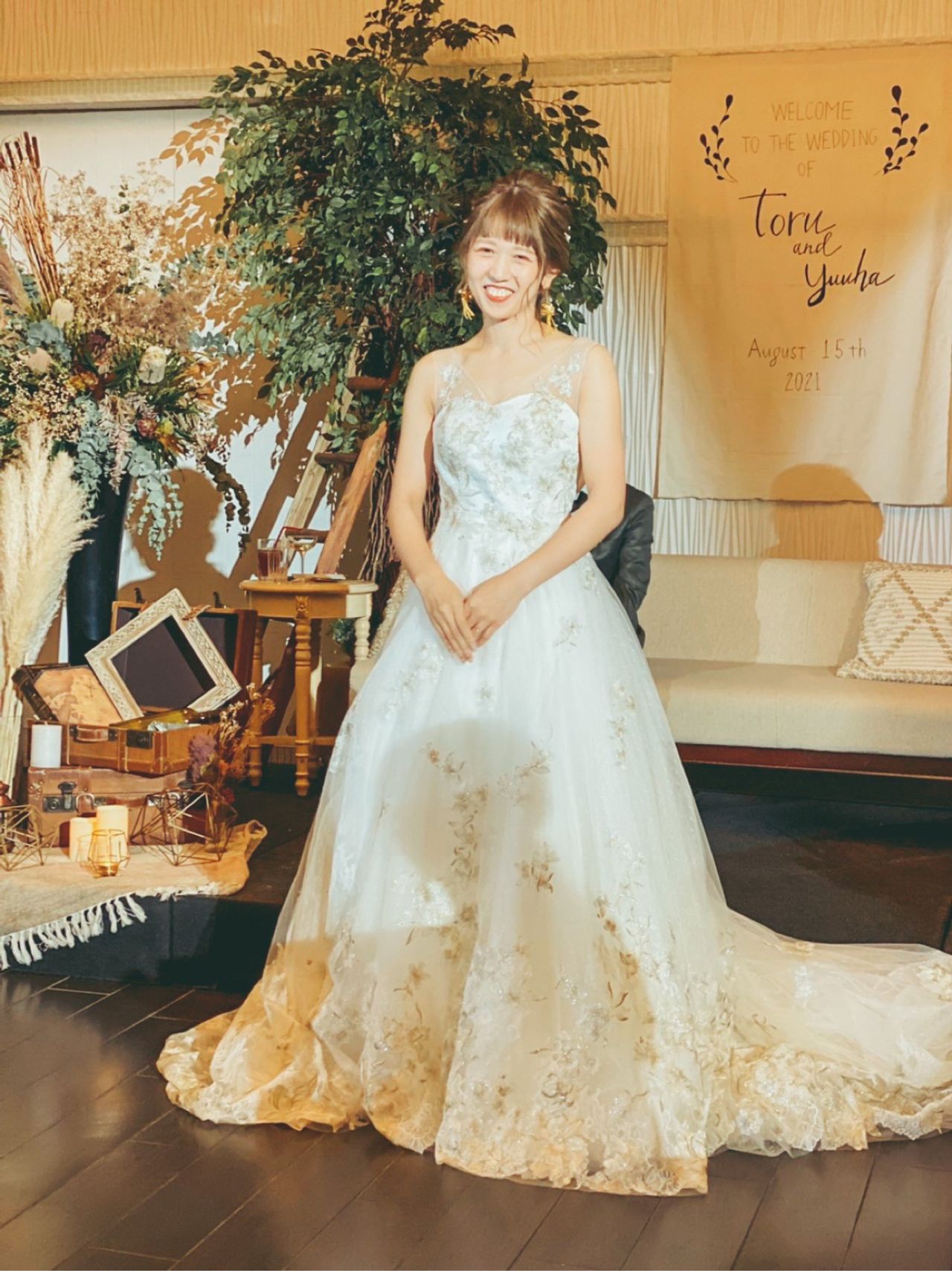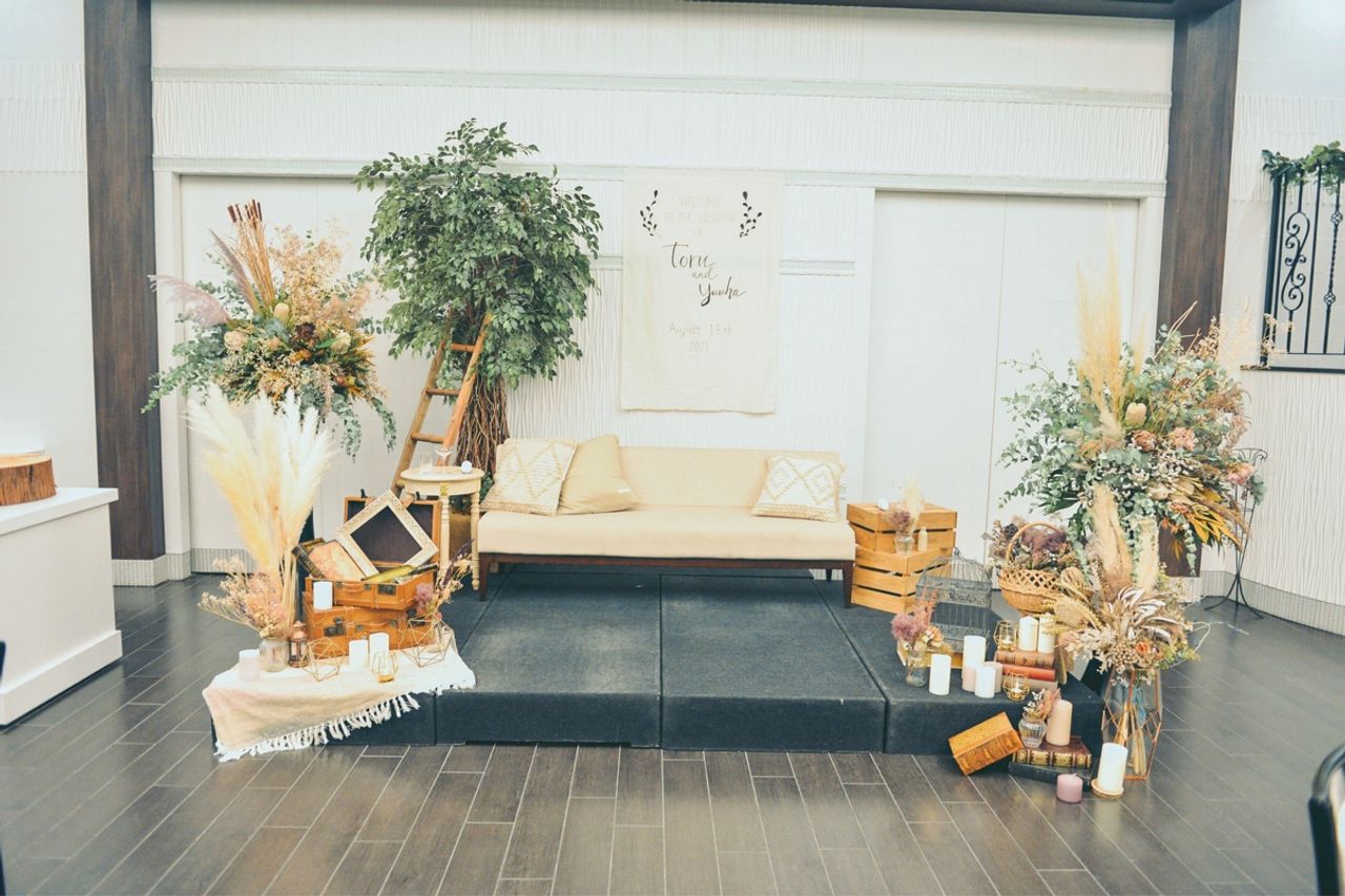 私たちはソファにしたので、お花は全てソファの周りに置いていただきました。ドライフラワーとユーカリを軸に、グリーンとブラウンの色でまとめました!ヴィンテージ感とナチュラル感の2つを演出しました💐