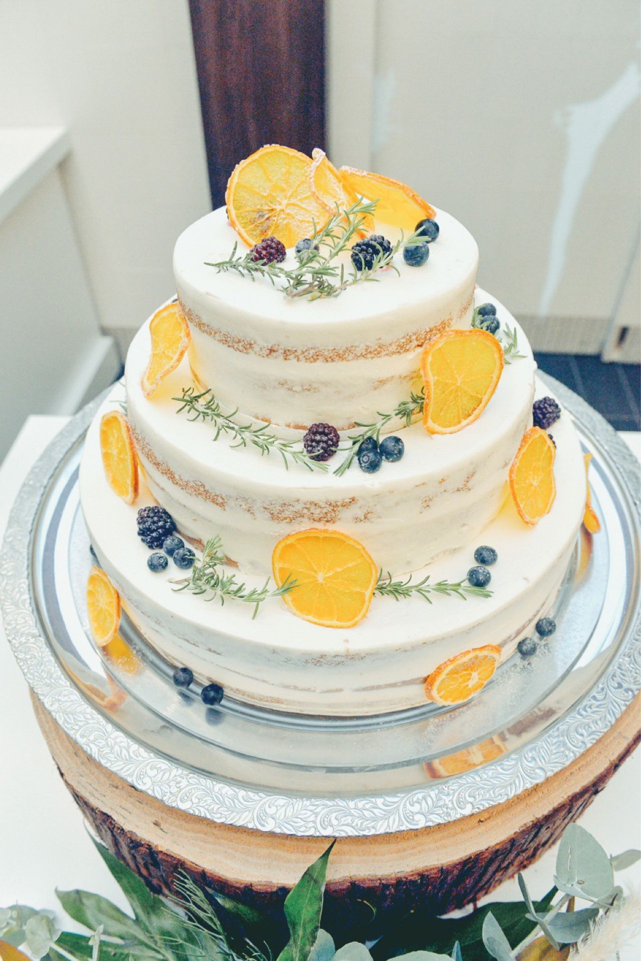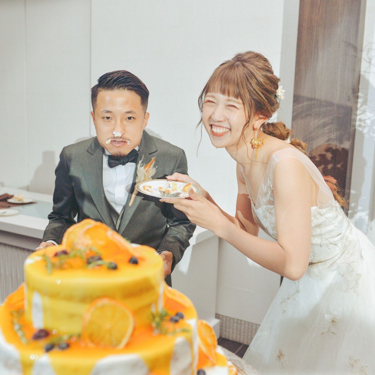 最初はベリー類で飾ってもらう予定でしたが、ケーキ入刀をカラードリップに変更し、マンゴー味のソースを使用する事になった為、急遽オレンジの飾り付けをお願いしました🍰おかげでブラウンの式場に合うケーキになりました❤︎