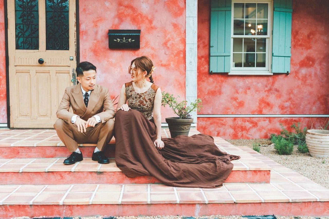 トレンドのビタミンカラーのドレスと凄く迷いましたが、ブラウンの統一感が欲しく、かつヴィンテージ感を出したかったのでブラウンドレスとキャメルのスーツにしました🧸シンプルだけど胸元の刺繍がしっかりあるのでオシャレに着たい花嫁様にはとてもオススメです🥰