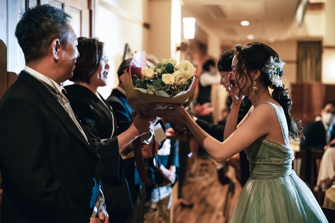 両親への手紙を読んでいる時は色んな感情が混みあげてきました。しっかり読もうと頑張って泣かずに読んだのですが、花束贈呈のために両親のもとへ行くと母親が泣いており私も我慢の限界で泣いてしまい、父親は優しく頭に手を置いてくれその場面はとても感動しました。
