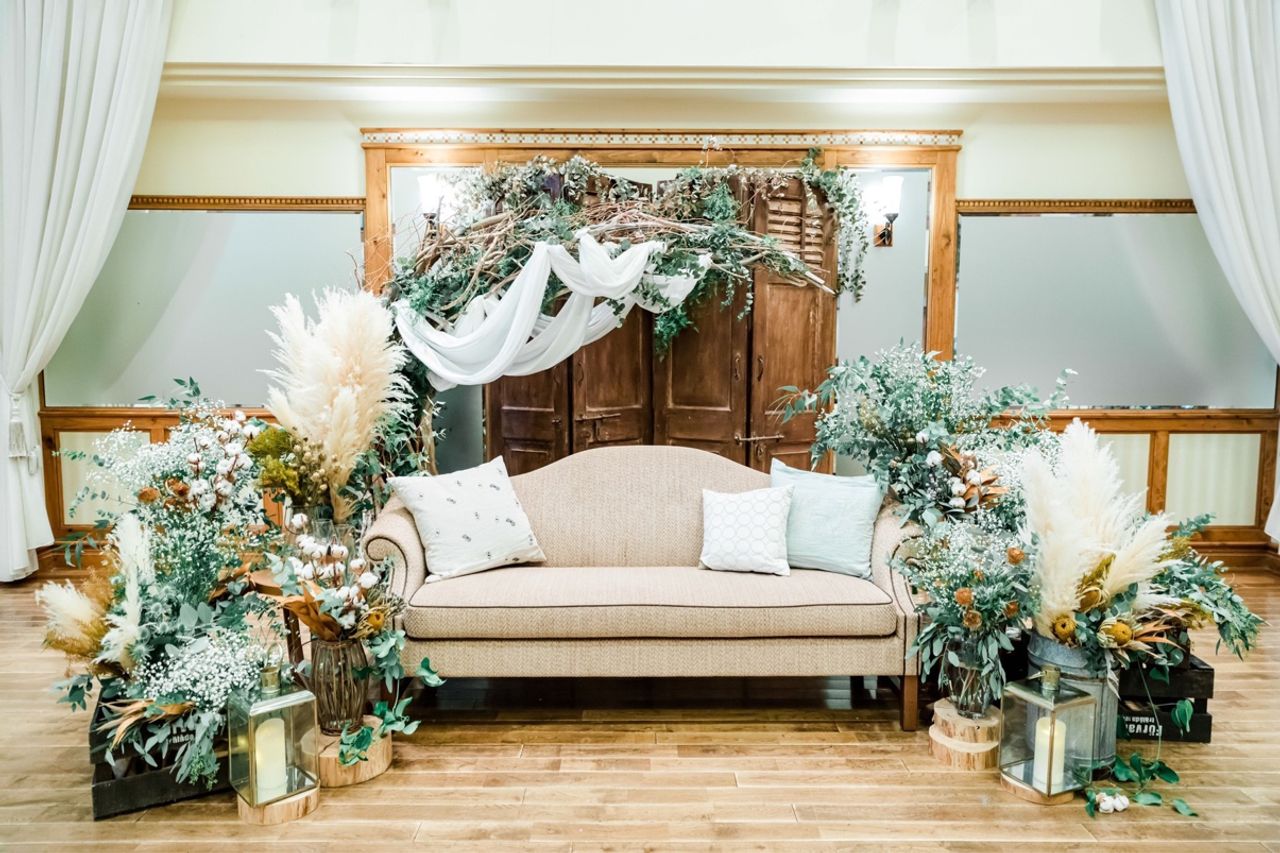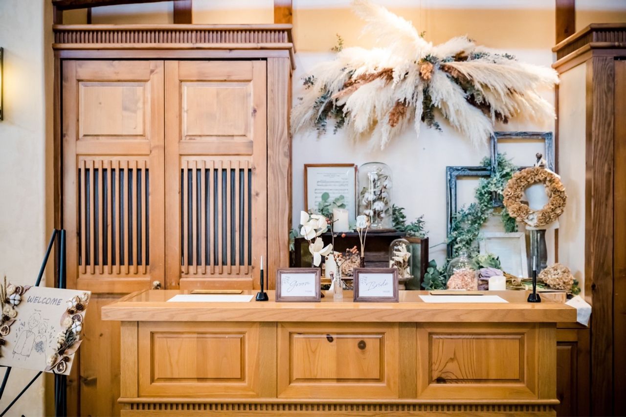 グリーンをメインにテーマカラーがマスタードイエローなのでその色を含め、パンパスグラスなど秋色の装花を使用してもらいました。