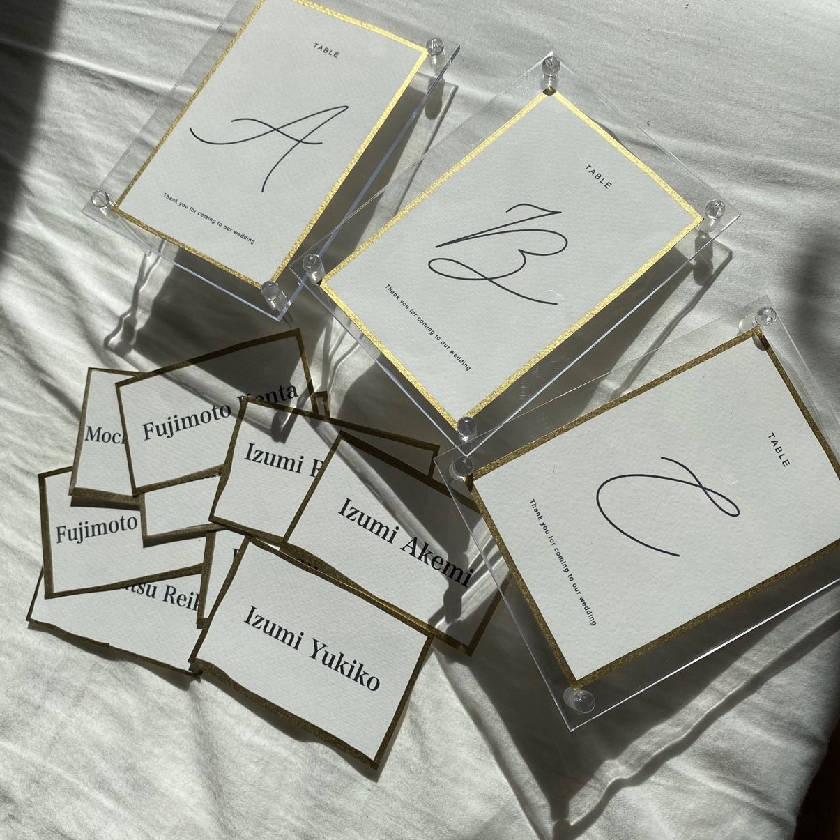 前撮りはプランについてる当日前撮りのみ、ウェルカムスペースは全て手作り。席札、テーブルナンバーも全て手作りしました。オープニングムービー、プロフィールムービーも友人に作ってもらいました。