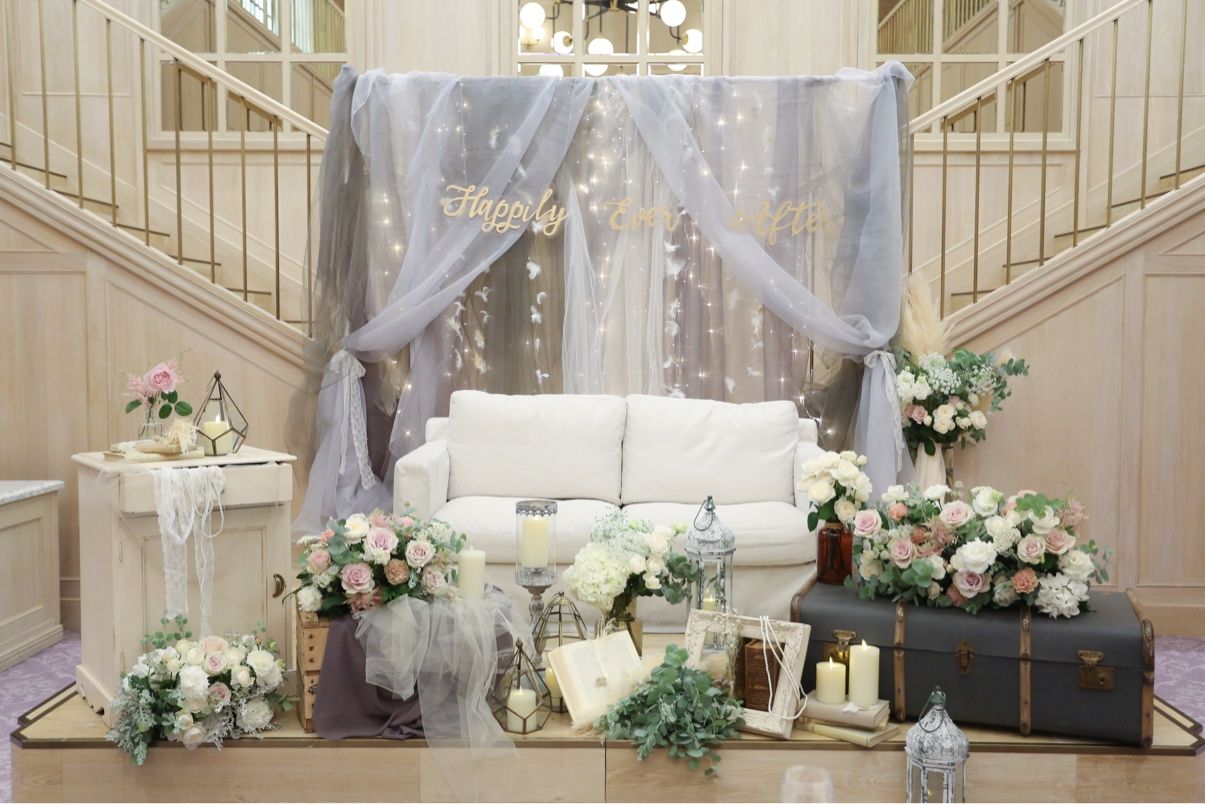 階段がある会場だったので、最初は高砂ソファーの後ろはカーテンを閉めた状態で、階段を使わないのかなと思わせながら、カーテンをくくり、ライトを垂らしていただき、階段をおりて、そのアーチをくぐって登場できたところがおススメです!
