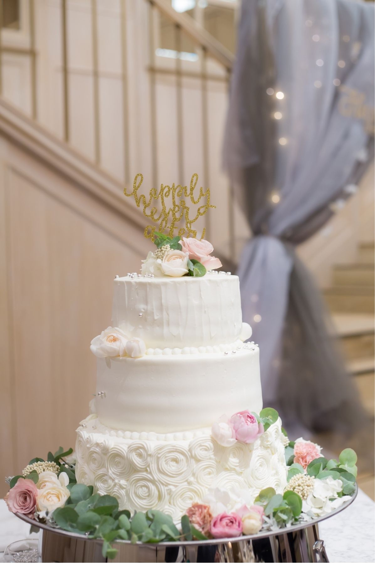 クリームの模様で3段分けて、上からアラザンを魔法と見立てて振りかける演出と、ケーキトッパーは、ハワイで500円で購入したhappily everafterのものを使いました!お得でした!