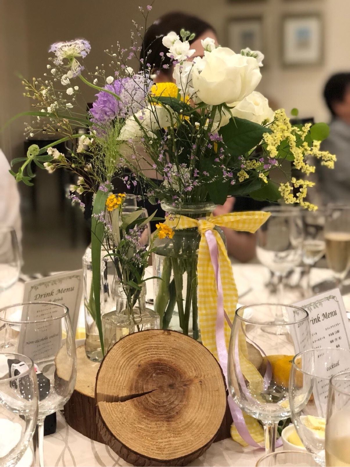 紫と黄色をメインに、大好きなカスミソウやピンポンマムを使ってもらいました。