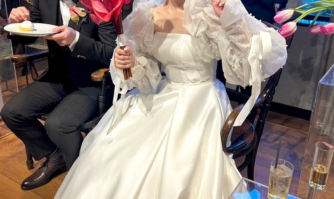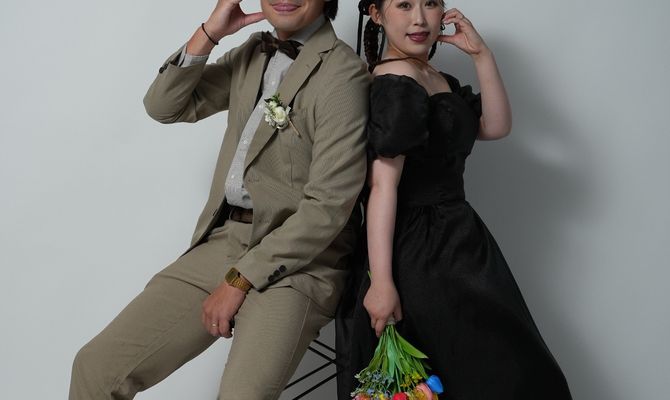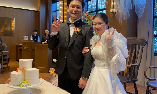 新婦はポップな雰囲気でとにかく派手なイメージが好み、新郎はなんでもかんでも茶色が好き!