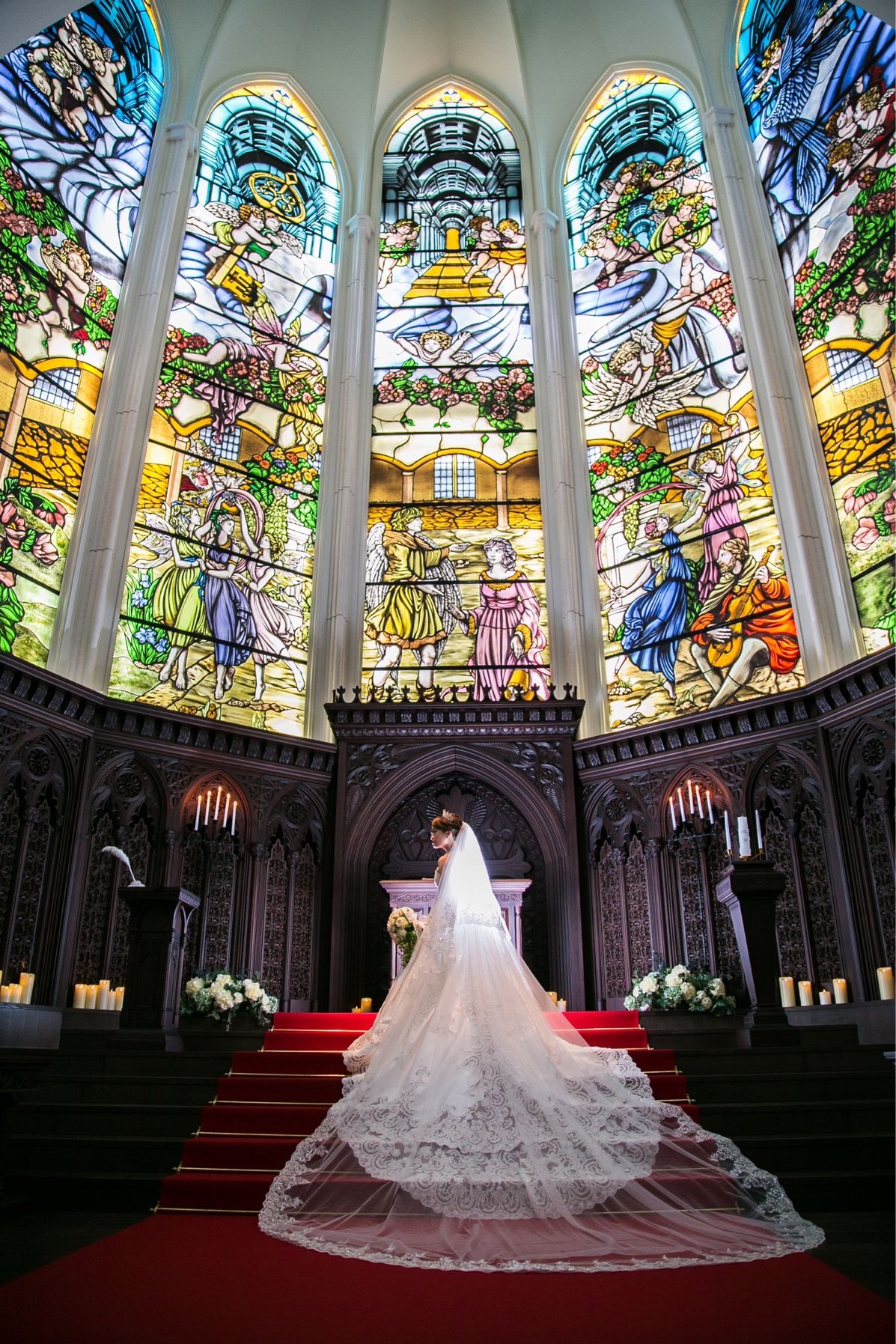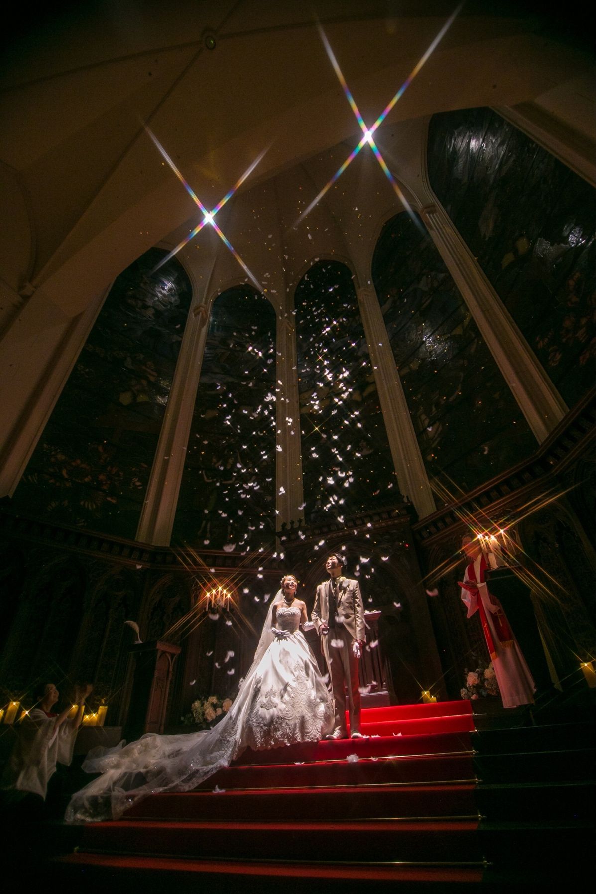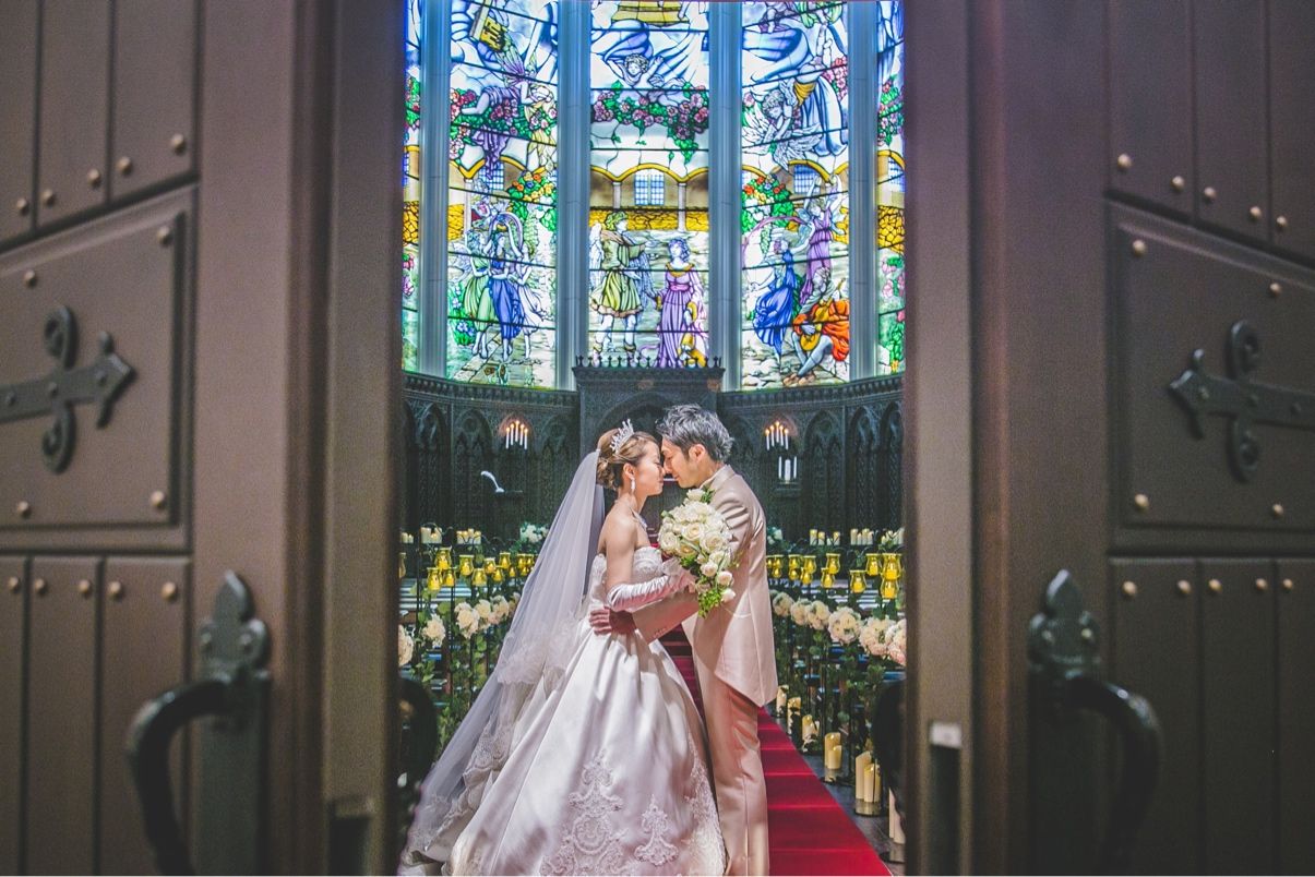 東京都内では数少ない大聖堂の挙式会場。外苑前駅から徒歩1分という招待客にも負担にならない場所にあるのが決め手にもなりました。ステンドグラスが素敵なだけではなくプラネタリウム演出や羽根や雪を降らせる演出、またロールスロイスで会場へ登場するビッグイベントもあるのが特徴的!ゲストが忘れられない演出が沢山あるところがポイントです!