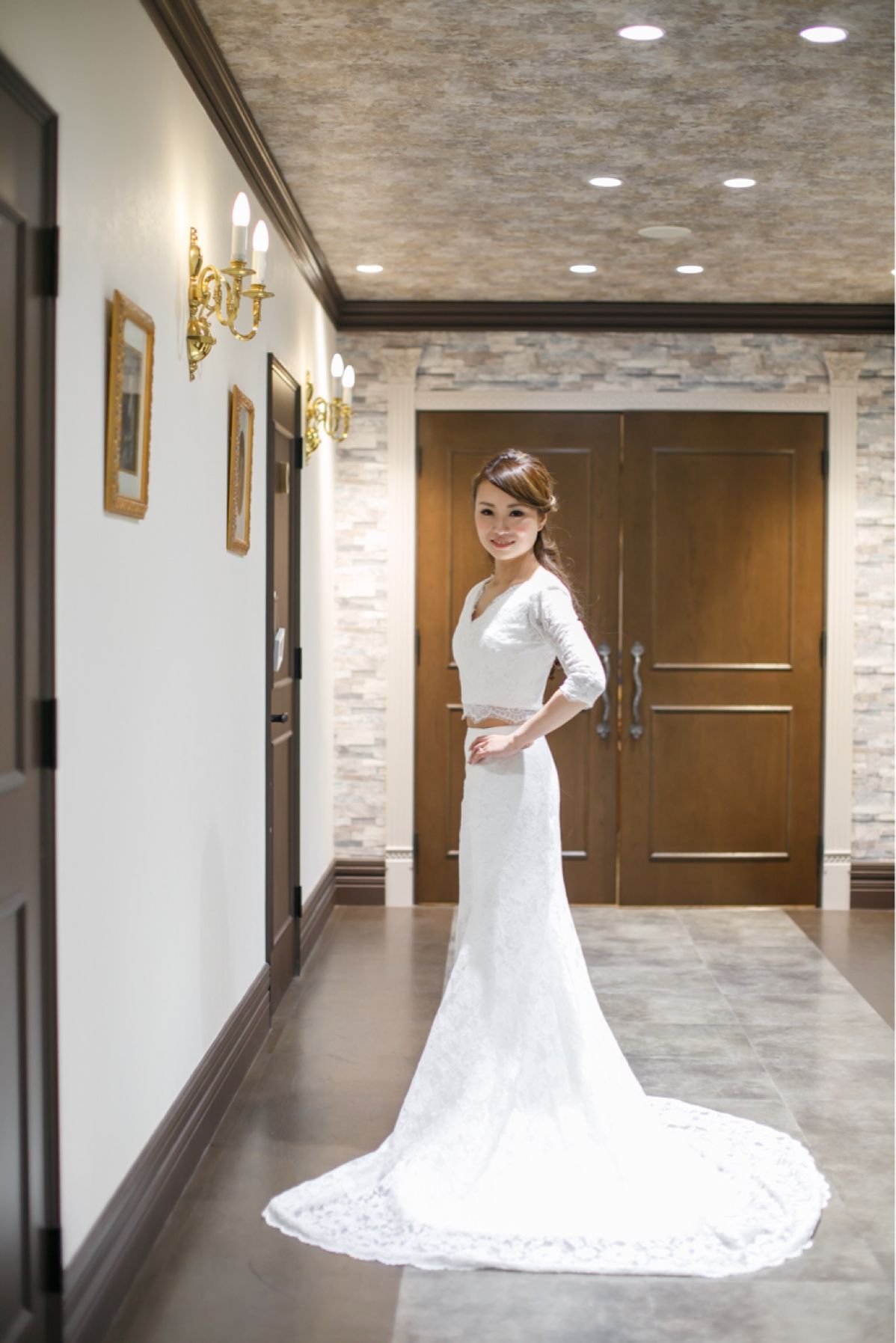 二次会ドレス。浜松にあるオーダードレスショップさんに一から自分がデザインしたウェディングドレスの作成をお願いしました。二次会と新婚旅行の後撮りで着るウェディングドレスだったので少しラフなウェディングドレスが良いなと思っていました。あとは総レースのマーメイドドレスにも憧れていたので、セパレートのマーメイドドレスを作って頂きました。トップは2wayなので袖なしにもなります!皆んなから褒められてとっても嬉しかったです!