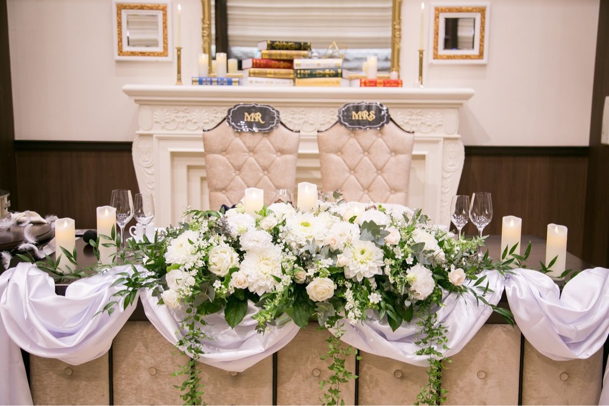 カラードレス色当てクイズをするのにバレないようにウェディングドレスに合うような装花にし、白のドレープをつけて貰いました!ドレープは設置料がかかりますが、装飾が豪華に見えるのでつけてよかったです!あとは持ち込んだLEDキャンドルも置いて貰いました!