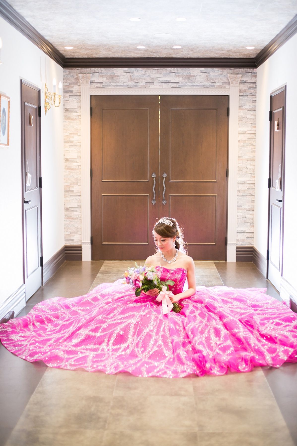 marryさんとコラボのキラキラ宇宙ドレス。ネイビーのキラキラ宇宙ドレスは着ている方がたくさん居ますが、人と被りたくなかったのでピンクの色にしました。派手すぎかな?と思いましたがボリュームもあり、インパクトがあったのでお色直しにはもってこいなカラードレスでした!