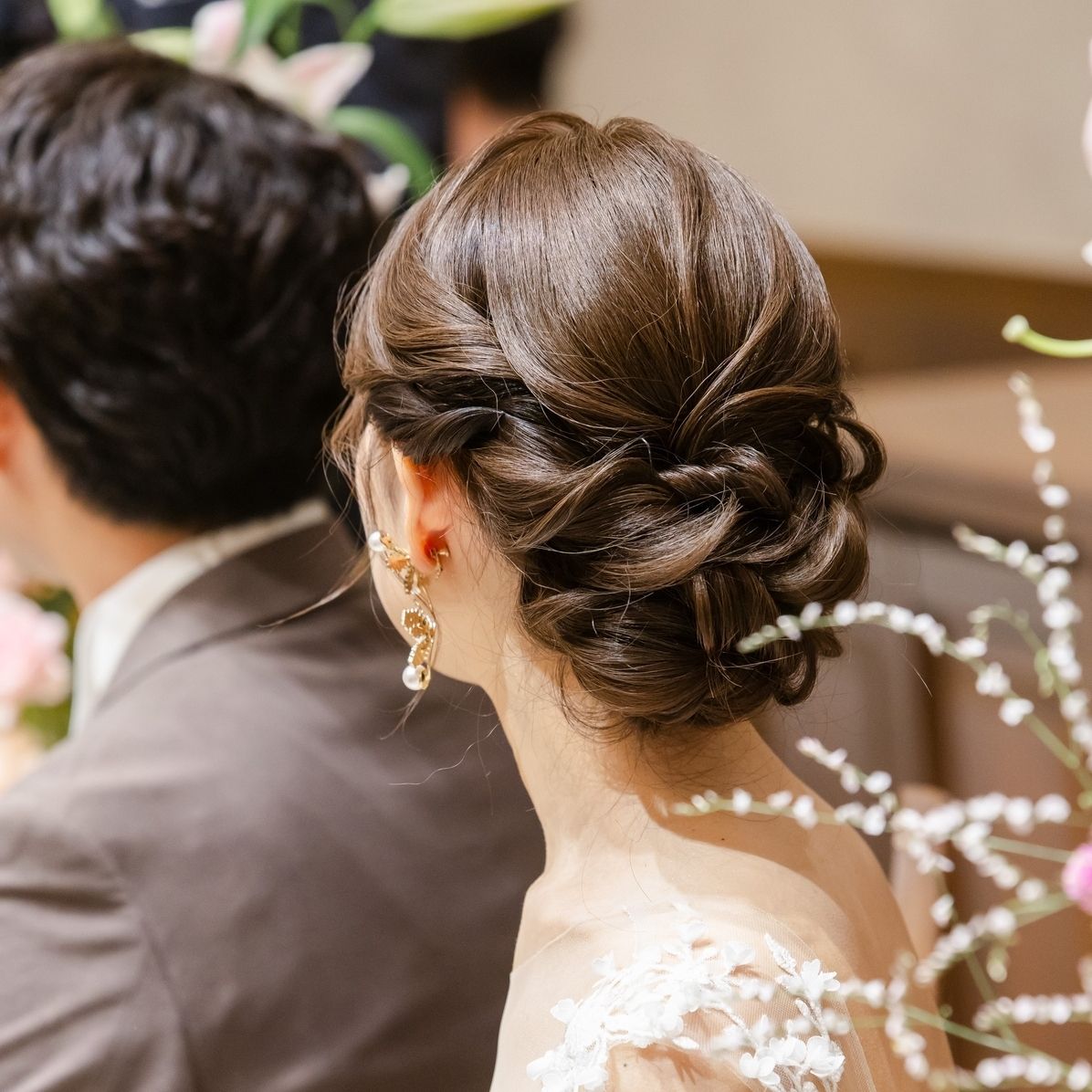 挙式はティアラを際立たせたかったため後れ毛は少なめのシニヨンにして、披露宴は後れ毛を増やしてフワフワにカジュアルダウンしてもらっています。