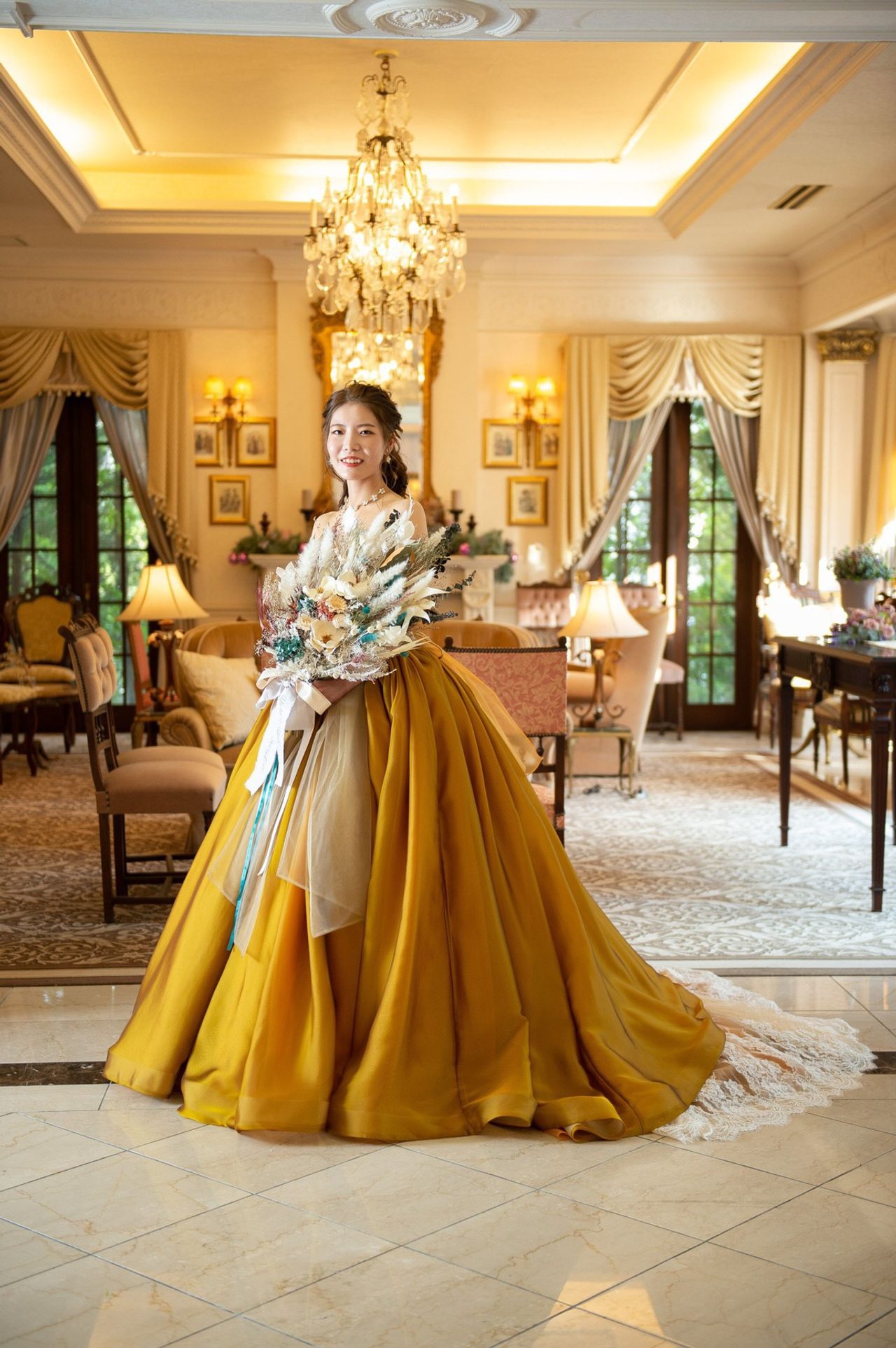 カラードレスは何十着も着て悩みましたが、他とは被らないアンティークゴールドという色合いに惹かれました!会場もアンティークなのでピッタリでした!サッシュベルトは取り外しができるのですが、可愛らしさが欲しかったので、私はサイドにリボンが来るようにつけました!