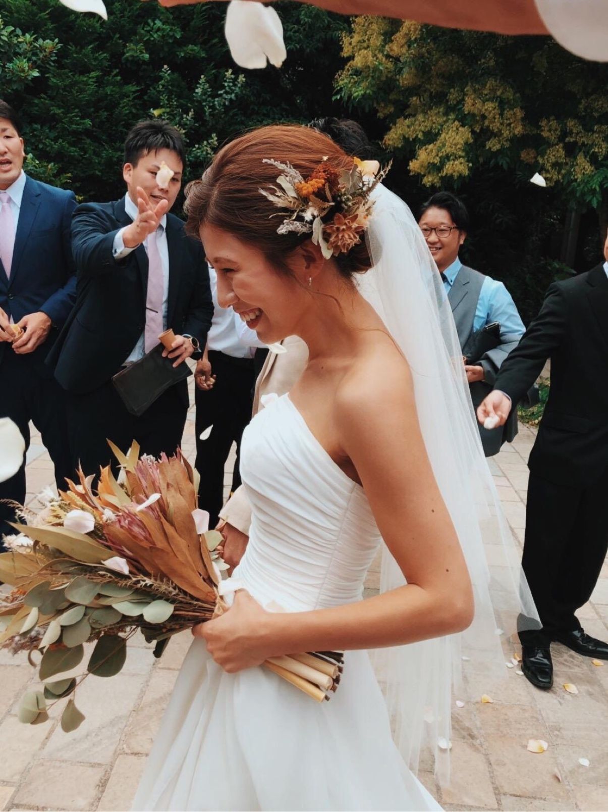 挙式から披露宴中座までは、ブーケと同じドライフラワーをヘアアクセに。 お色直しからは、プリュイのシンプルなヘアアクセ。