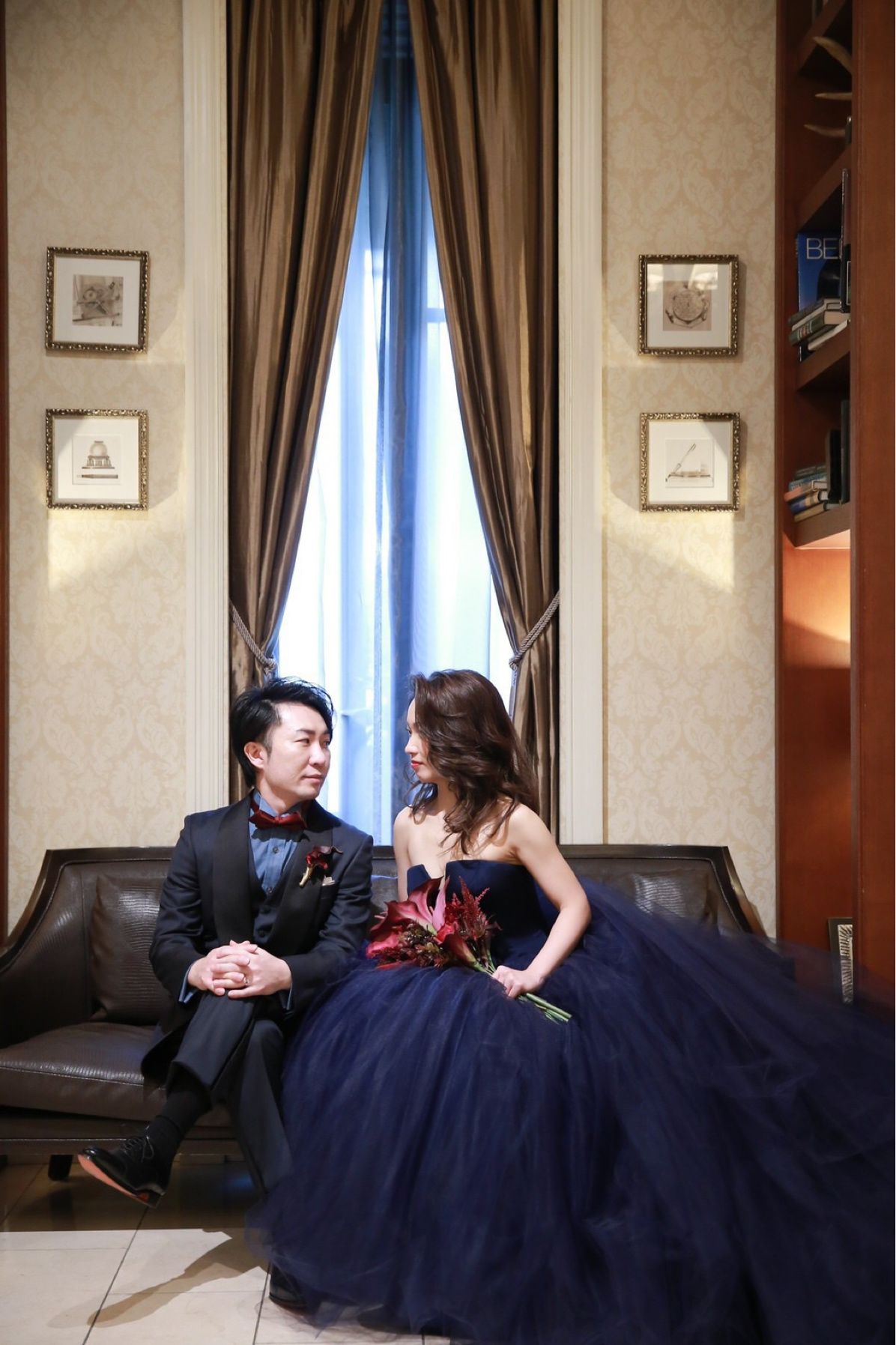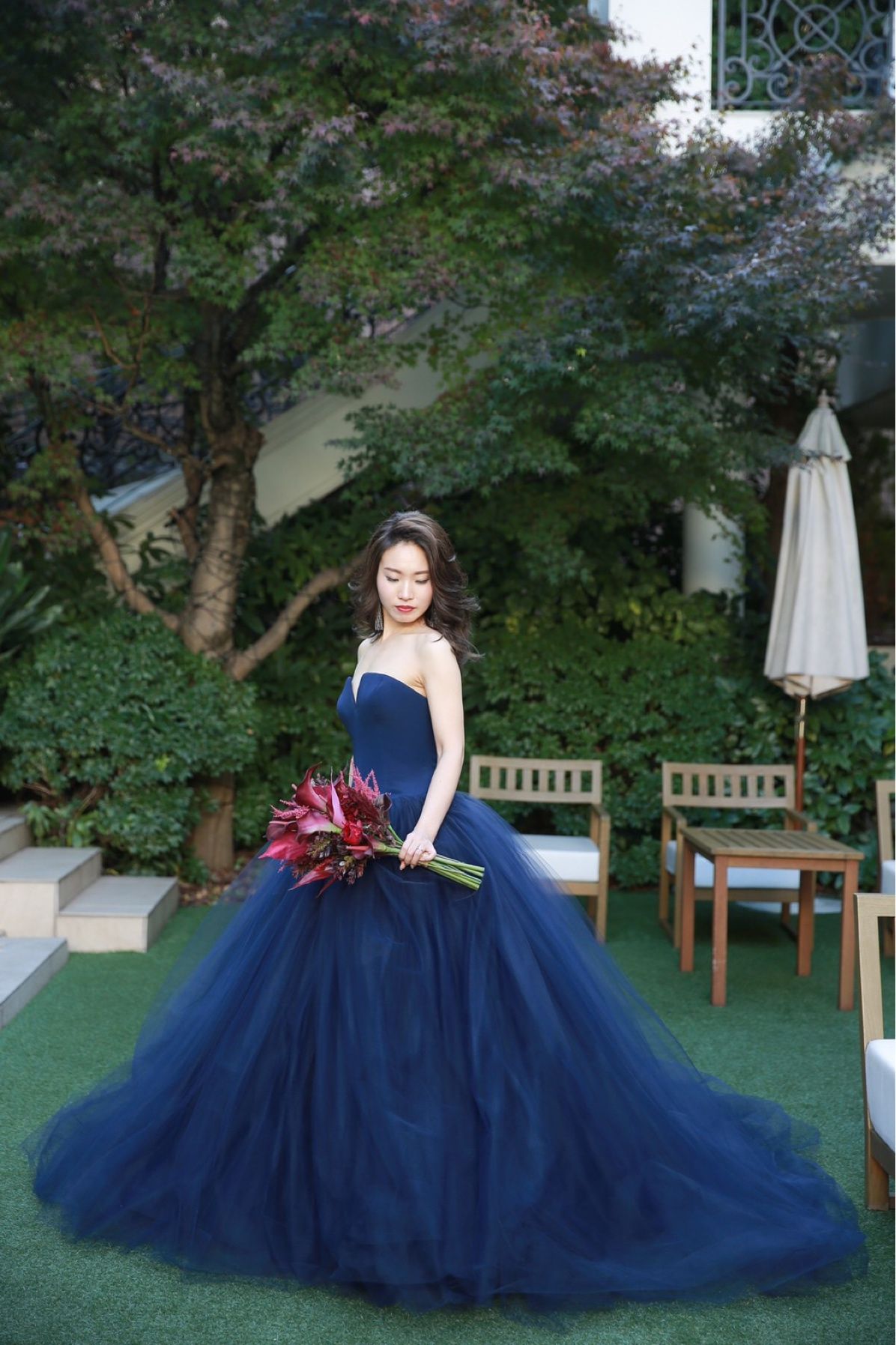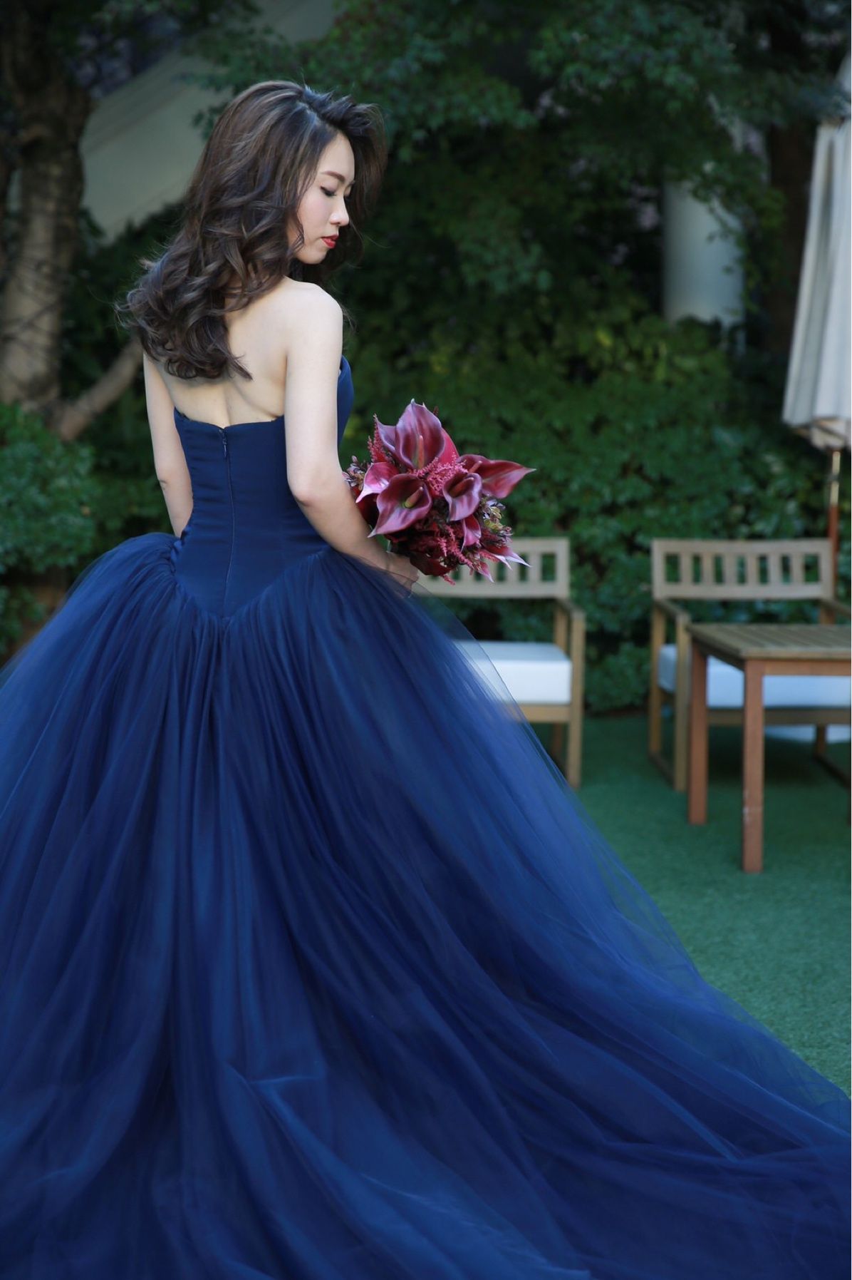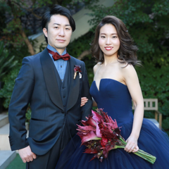 インスタで深みのあるShade Blueを見つけた時、こんなに美しいドレスがあるのか…と感動しました。ウェディングドレスは甘い印象のSISSIと決めていたので、カラードレスは大人っぽいドレスで、ゲストの印象をガラッと変えたいという思いでFernandaに決めました。
