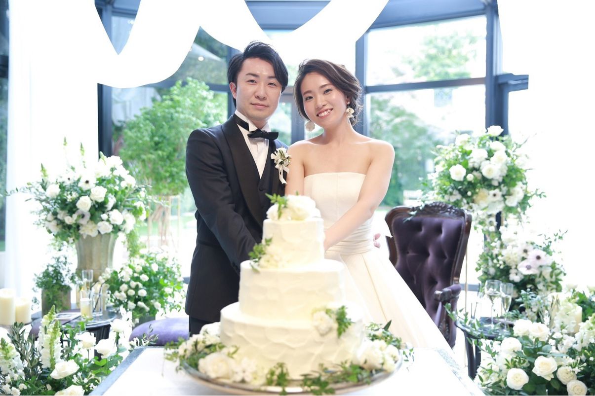 正直そこまでケーキに拘りがなかったので、フルーツやお花で装飾することは極力避け、テーマに沿った白を基調とした小さいお花や緑を添えていただきました。