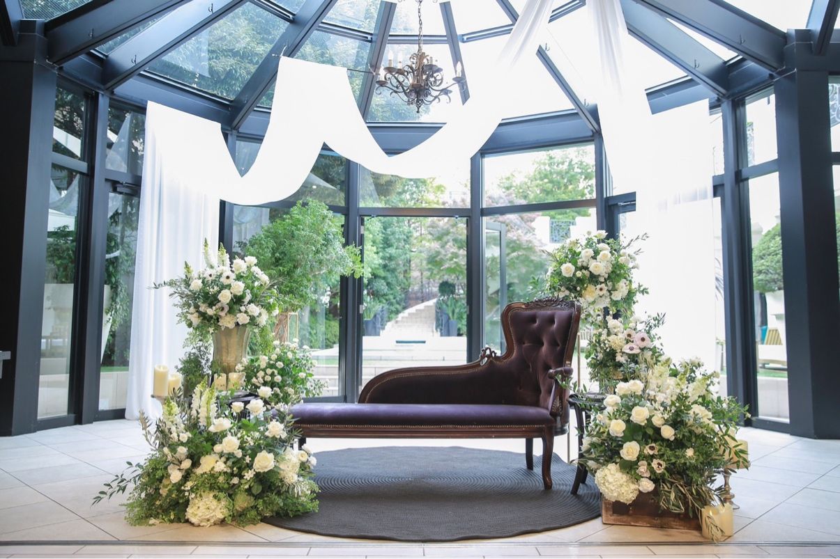 午前の部でお式を執り行った私たちは、コンサバトリーから入ってくる自然光に、白と緑とゴールドを基調とした装花が照らされ、とても明るく上品なお写真を撮ることができました。入り口が何箇所かあるので、サプライズ演出にはおすすめの会場です!