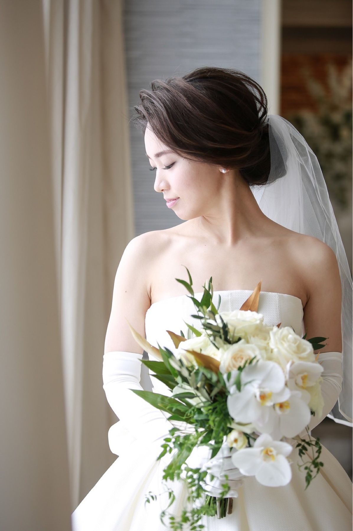 ・挙式は、クラシカルで上品な印象にしたくて、つるんとした質感を重視したヘアスタイルに。メイクもSISSIに合わせた柔らかな印象に仕上げていただきました。