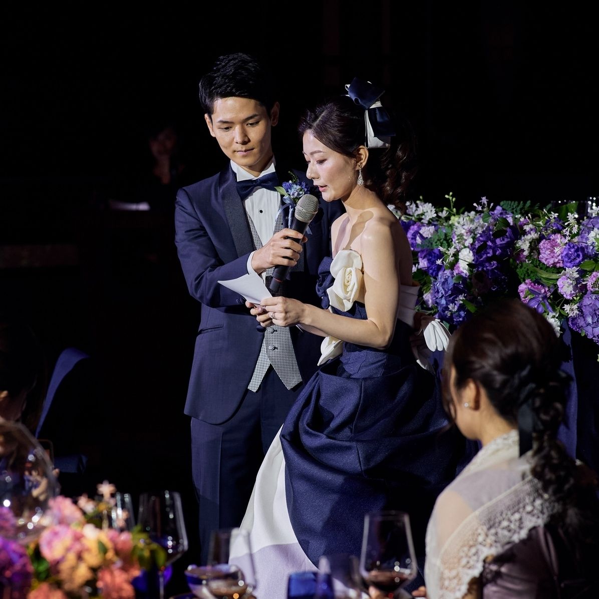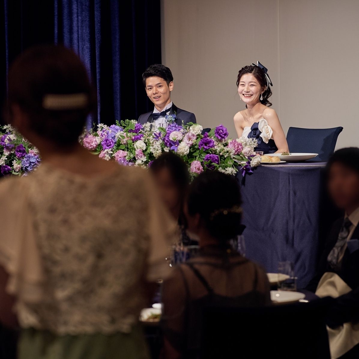 また、王道・クラシカルなイメージをもっていたのでテーマカラーは紫、青。初夏の結婚式だったため、さわやかなイメージを感じたくて装花には緑も少し入れました。